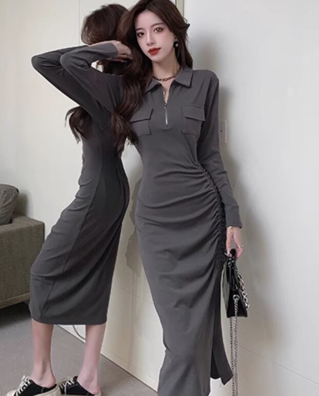 レディース スカート ワンピース プルオーバー タイトスカート 膝下 ミモレ 長袖 襟付き タイト スリム 細身 ストレート Iライン ファスナー ハイウエスト ヴィンテージ 薄手 大人可愛い きれいめ シンプル カジュアル かっこいい レトロ ラフ クール 存在感 無地 春 秋 ママ OL 学生 デート お出かけ お泊まり リゾート 旅行 レストラン 公園 女子会 休日 バカンス 高原 ガーデン ショッピング お花見 合コン コーデ 普段使い モテ S M L ブラック グレー カーキ 緑 グリーン