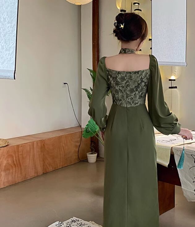 レディース スカート ワンピース ドレス ロングスカート ミモレ ロング 長袖 スクエアネック 襟なし タイト スリム 細身 ストレート フォーマル スマート スリット サイドスリット ハイウエスト 異国風 切り替えデザイン 薄手 きれいめ 上品 おしゃれ かっこいい アジアン エスニック エキゾチック 個性的 クール エレガント モダン 主役級 存在感 フォーマル 無地 花柄 二次会 披露宴 発表会 ハロウィン 美脚 脚長 インスタ映え L XL 2XL 3XL 4XL 大きいサイズ ブラック グリーン