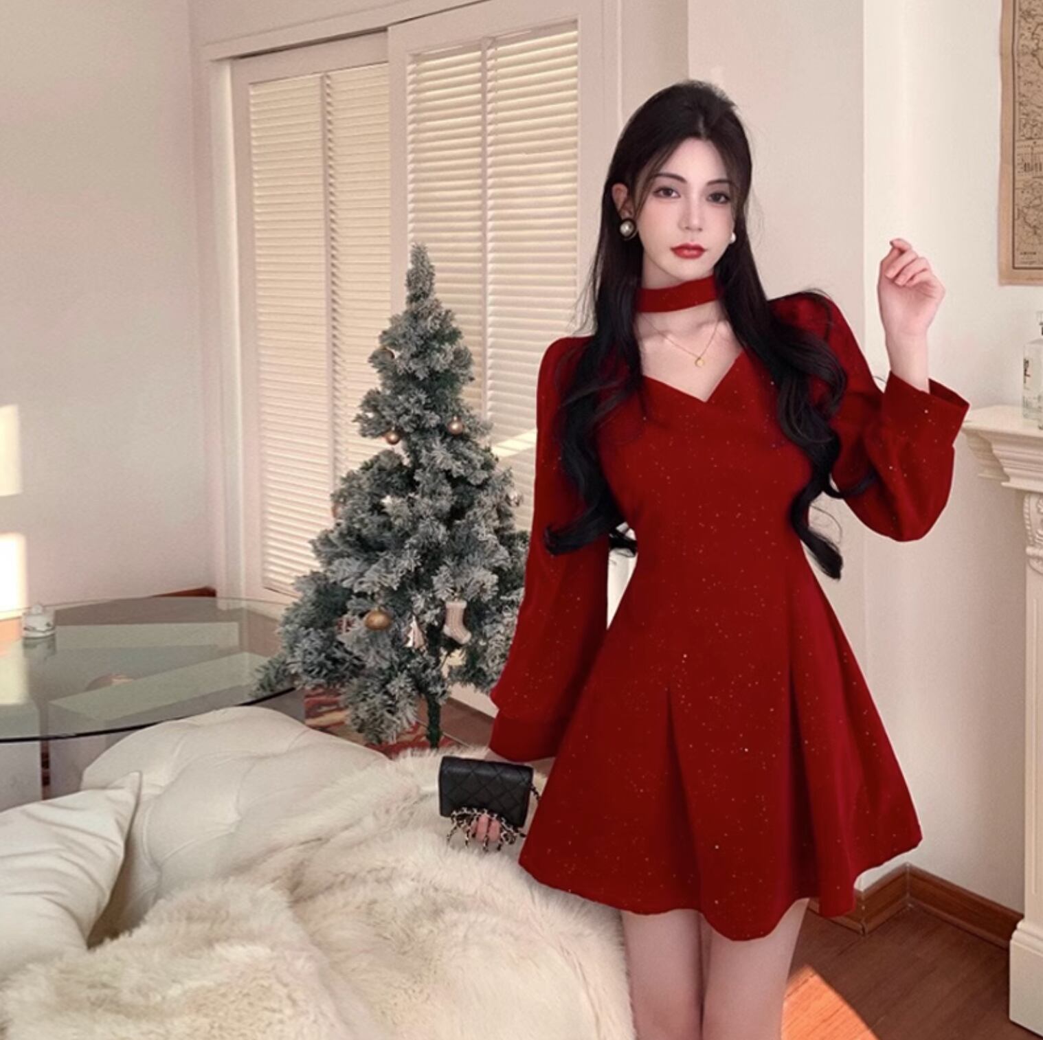 レディース ワンピース ドレス ミニ チョーカー ラメ ベルベット 長袖 バルーンスリーブ Vネック 襟なし Aライン フェミニン バックリボン ハイウエスト タック かわいい 大人可愛い きれいめ シンプル 上品 おしゃれ レトロ こなれ感 ガーリー エレガント 主役級 ラブリー キュート 無地 春 秋 冬 発表会 デート お出かけ お泊まり パーティー イベント 休日 ホテル 発表会 韓国 コーデ 体型カバー モテ インスタ映え S M L XL 黒 ブラック レッド