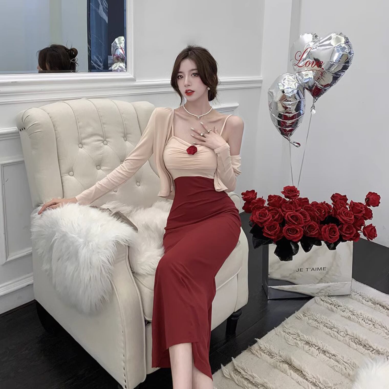 パーティードレス レディース ワンピース カーディガン セットアップ 2点セット ローズ ロング丈 マーメイド ノースリーブ 長袖 タイト スリム ハイウエスト かわいい 大人可愛い きれいめ シンプル 上品 おしゃれ レトロ こなれ感 ガーリー エレガント ラブリー セクシー 無地 春 夏 秋 結婚式 二次会 披露宴 デート お出かけ お泊まり パーティー イベント リゾート 旅行 休日 お呼ばれ バカンス 重ね着 体型カバー 普段使い 着回し S M L バイカラー ベージュ レッド