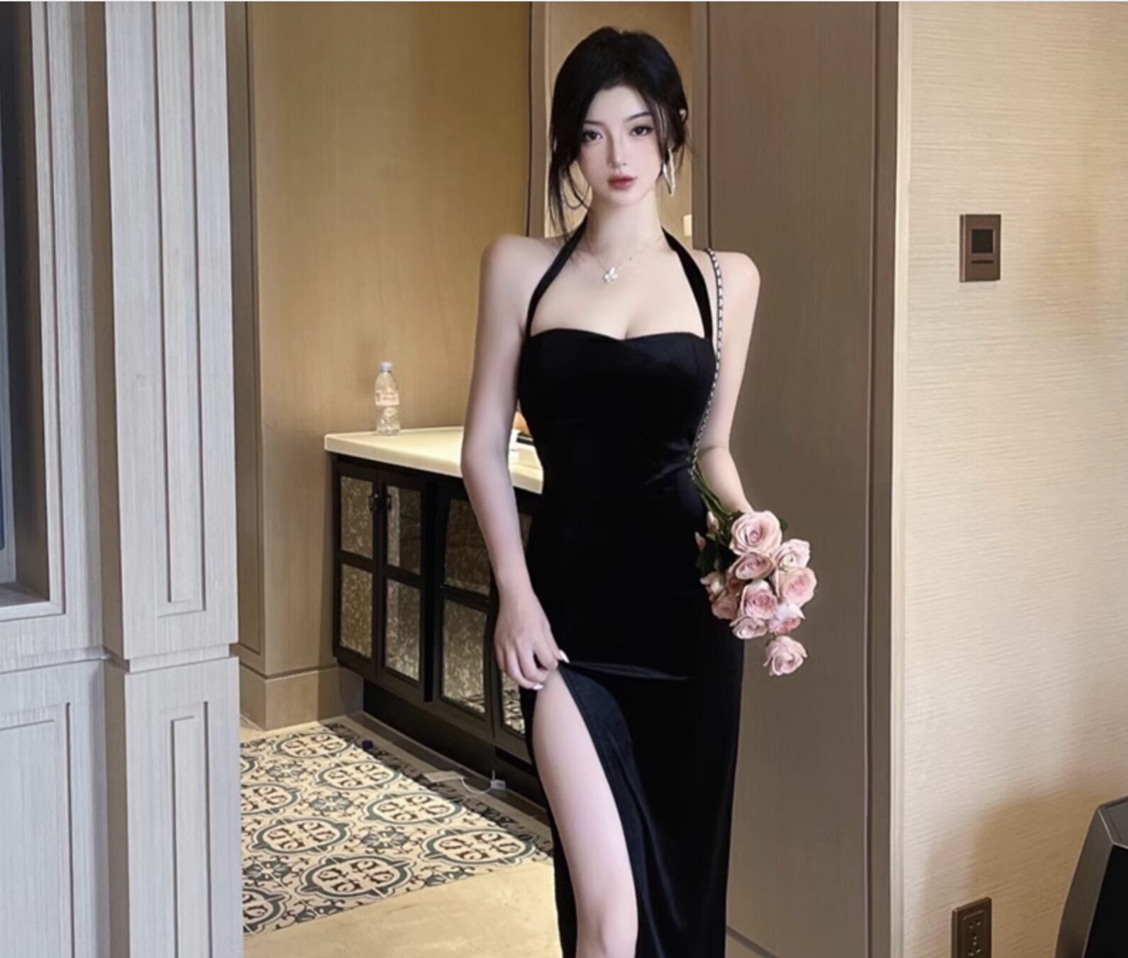 お呼ばれやパーティーにぴったりのセクシーなドレスです。ホルターネックと背中開きデザインで、肌見せが大胆に。タイトなシルエットデザインは、女性らしい曲線を引き出します。深いスリットがセクシーさを一層アップさせ存在感を放ちます。