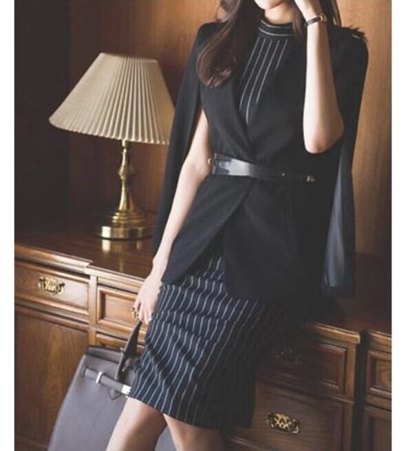 スタイリッシュ スカートスーツ レディース セットアップ ジャケット ミディアム丈 ノーカラー Vネック アームスリット ワンピース ノースリーブ ハイネック スタンドカラー タイト スリム 細身 ベルト ウエストマーク バックスリット ハイウエスト きれいめ シンプル 上品 おしゃれ かっこいい クール エレガント かっちり 都会的 大人っぽい 無地 ストライプ柄 春 夏 ママ オフィス ビジネス OL 通勤 デート お出かけ 会食 脚長 S M L XL 2XL 大きいサイズ 黒 ブラック モノトーン