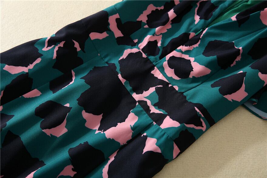 Vネックとフレアスリーブが女性らしさを引き立てるマキシワンピース。ハイウエストでスタイルアップ効果も期待できます。上品な緑のヒョウ柄がさりげないセクシーさを演出。大人可愛いレトロな雰囲気と異国風のデザインで、華やかなおしゃれを楽しめます。