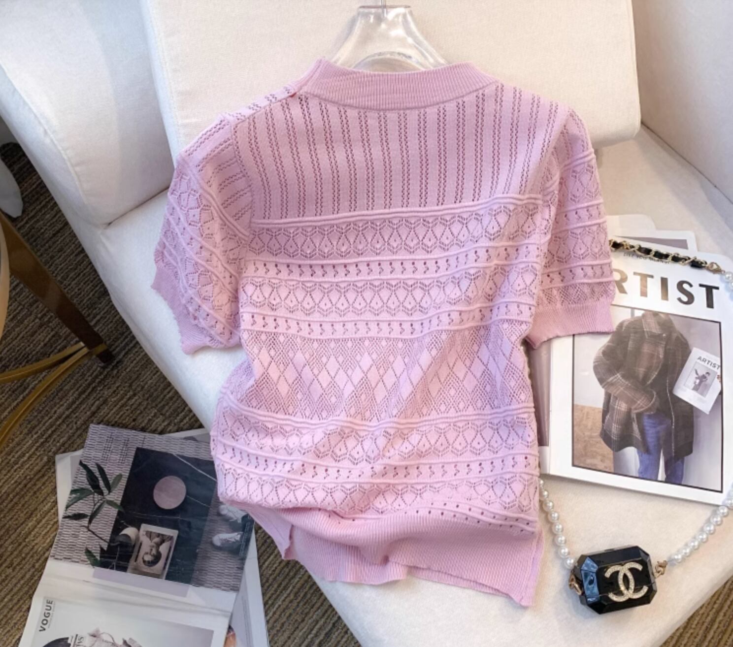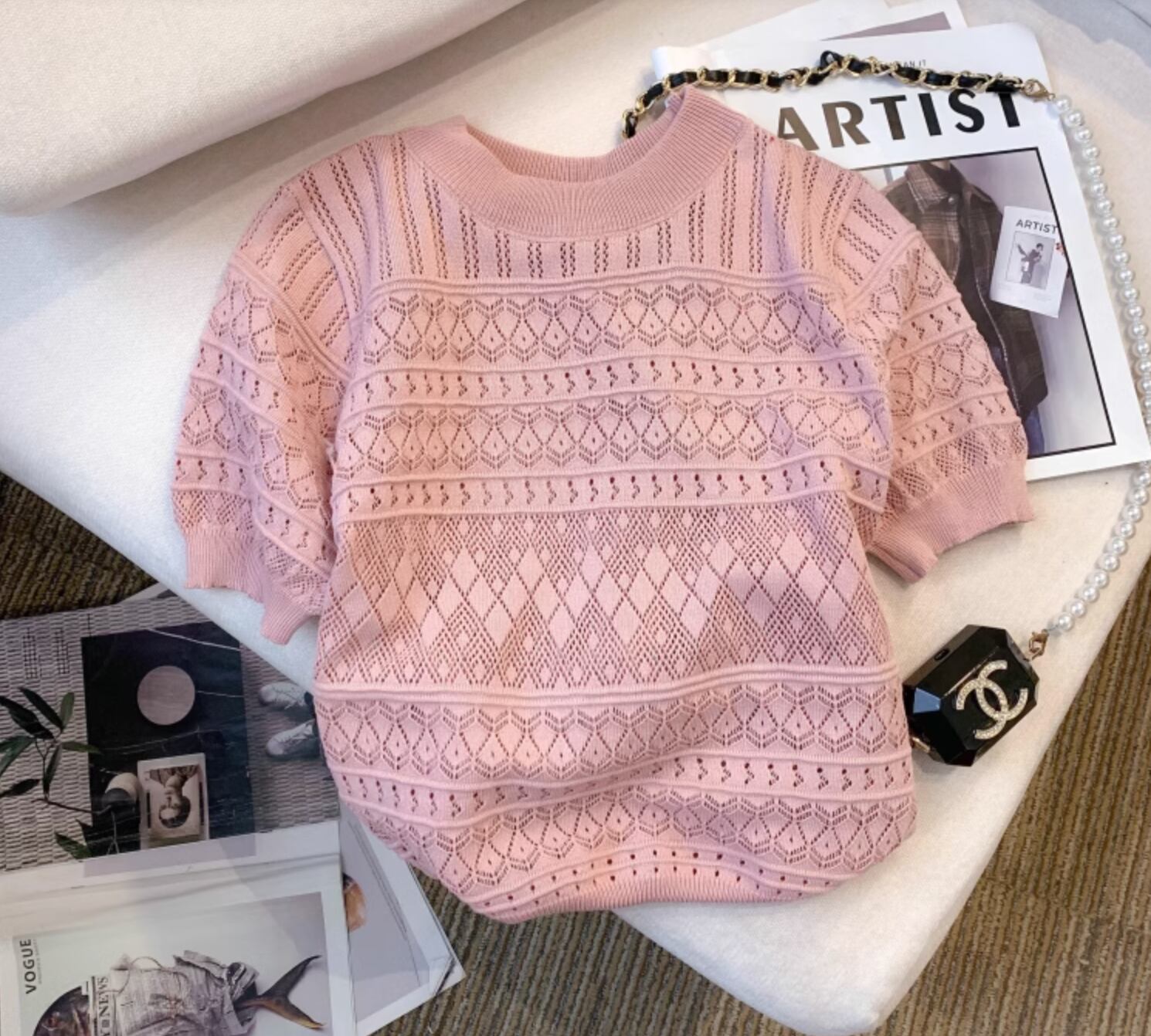 色々なシーンで使える便利なサマーニットです。透かし編みのデザインが軽やかで可愛らしく、女性らしい雰囲気を演出します。ショート丈で、トップスとしてだけでなく、インナーとしても使えるので、着まわし力も抜群です