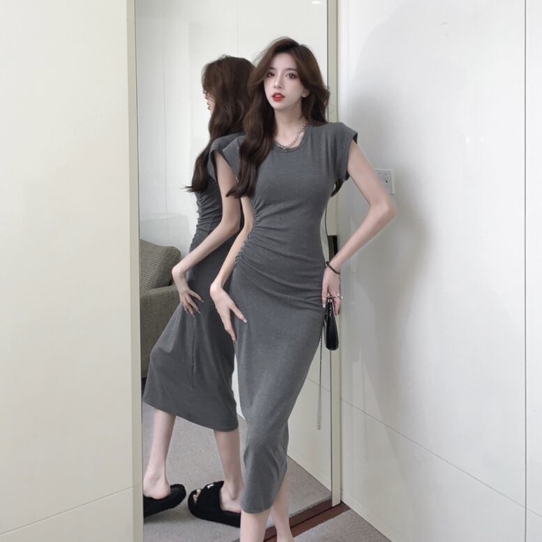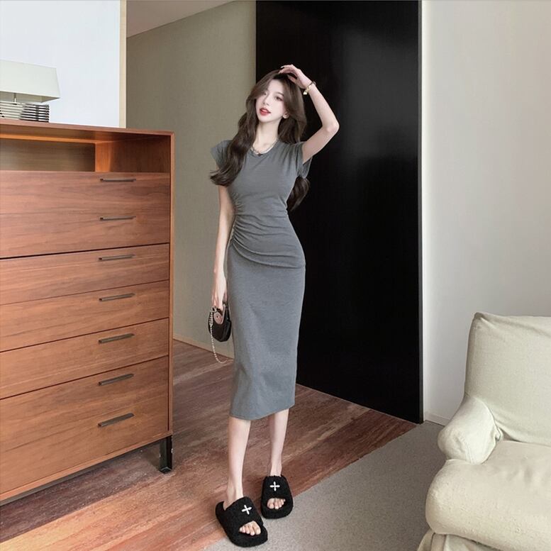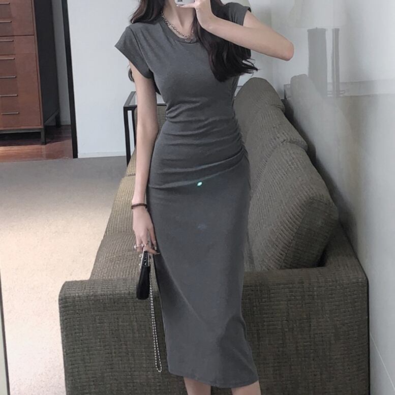 サイドギャザータイトシャツワンピース レディース ワンピース シャツワンピ フレア ロング 半袖 ラウンドネック タイト スリム 大人可愛い きれいめ 上品 春 夏 通勤 通学 デート ゆったり 黒 ブラック グレー
