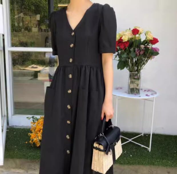可憐で女性らしいスタイルを演出するワンピースです。Vネックのデザインが首元をすっきりと見せ、フレアのデザインが女性らしいシルエットを作り出します。膝丈の丈感は上品さを演出しつつ、カジュアルな印象も与えます。シンプルなデザインなので、様々なシーンで活躍すること間違いなしです。春夏のデートやお出かけ、イベントなどにぴったりな一枚です。