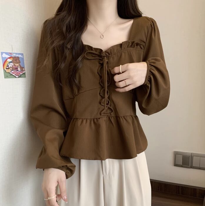 シャツ ショート 長袖 パフスリーブ スクエアネック セミフレア スリム 細身 ストレート フェミニン ウエストリボン かわいい 大人可愛い きれいめ シンプル カジュアル おしゃれ レトロ ラフ ガーリー ナチュラル 無地 春 秋 レディース 女性用 女の子 10代 20代 OL 通勤 通学 デート お出かけ イベント リゾート 旅行 レストラン 公園 女子会 休日 バカンス ガーデン ショッピング カフェ 楽ちん 普段使い 着回し モテ 清楚 S M L ホワイト ブラック ブラウン アプリコット