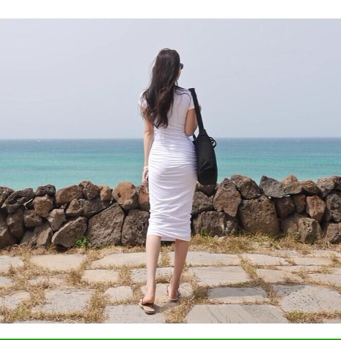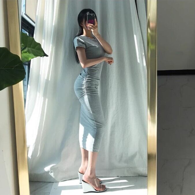 サイドギャザー ボディコンシャス ワンピース 膝下 ミモレ ロング 半袖 クルーネック 襟なし タイト スリム 細身 スマート ストレッチ 伸縮性 きれいめ シンプル カジュアル 上品 おしゃれ かっこいい こなれ感 セクシー 大人っぽい 女っぽ フェミニン 無地 春 夏 ママ 学生 学校 通学 デート お出かけ リゾート 旅行 ビーチ 休日 バカンス ショッピング 韓国 オルチャン コーデ 普段使い スタイル S M L XL すっきり 白 ホワイト 黒 ブラック 灰色 グレー モノトーン カラバリ