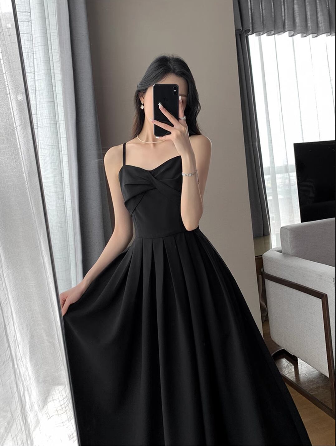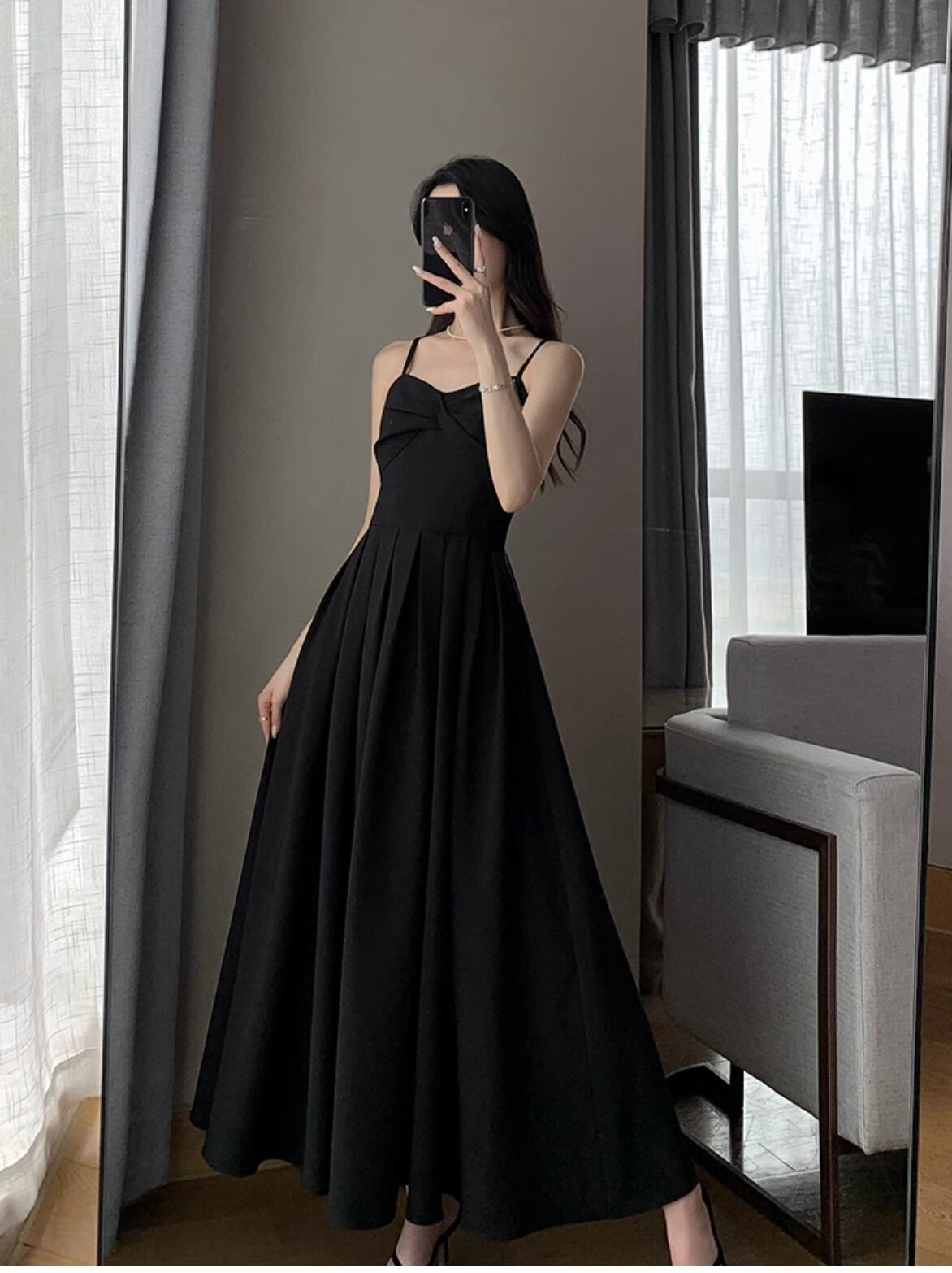 シンプルな黒のマキシワンピースです。Aラインシルエットが女性らしさを引き立て、気品と可愛らしさを兼ね備えています。シンプルなデザインなので、様々なシーンに合わせやすく、普段使いからお呼ばれイベントまで幅広く活躍します。