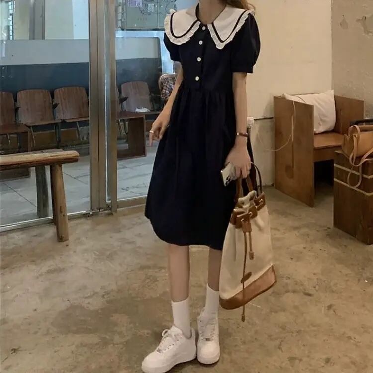 フレアワンピース レディース ワンピース 膝丈 半袖 パフスリーブ ラウンドネック 襟付き 丸襟 フレア Aライン フリル ハイウエスト ボタン かわいい シンプル カジュアル おしゃれ レトロ ガーリー エレガント ラブリー キュート クラシカル ロマンティック 清潔感 ロマンチック お洒落 華やか 爽やか 無地 春 夏 女性用 デート お出かけ 公園 女子会 ガーデン 韓国 オルチャン 体型カバー 脚長 モテ 清楚 スタイルアップ 動きやすい S M L 3色展開