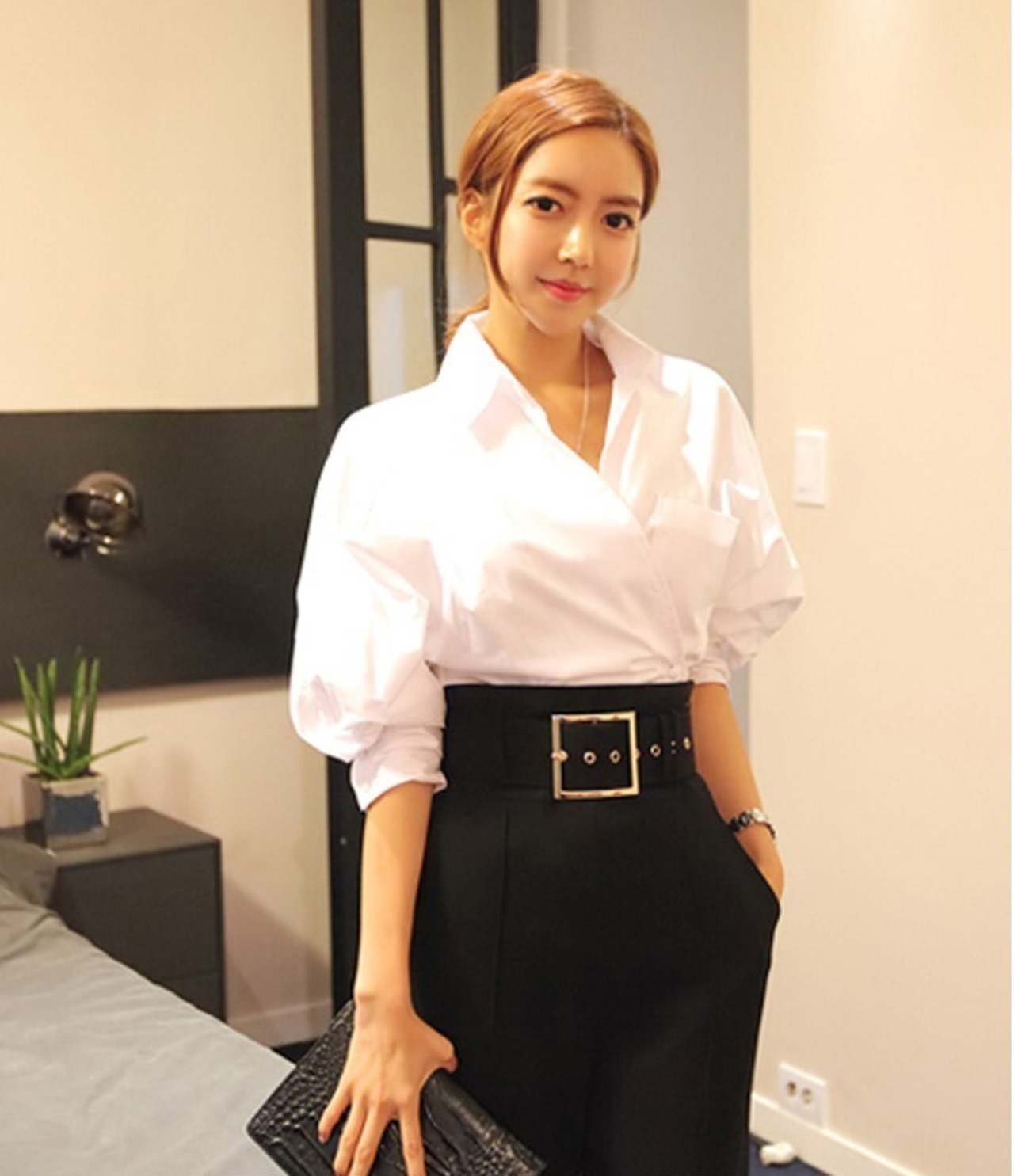 ブラウスは後ろ腰にゴム入りで裾を出してもすっきりとした印象。袖を少しプッシュアップして着るとふんわり感が出る五分袖~七分袖の女性らしいデザインです。パンツはメタリックなバックルがかっこいい太めベルトが付いたハイウエストデザインで、体型をカバーしながら脚長効果も期待できます。