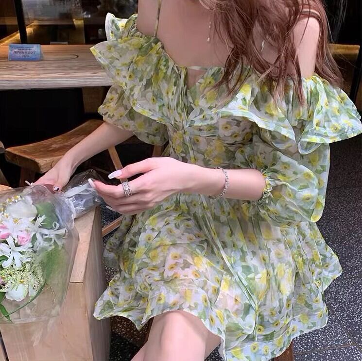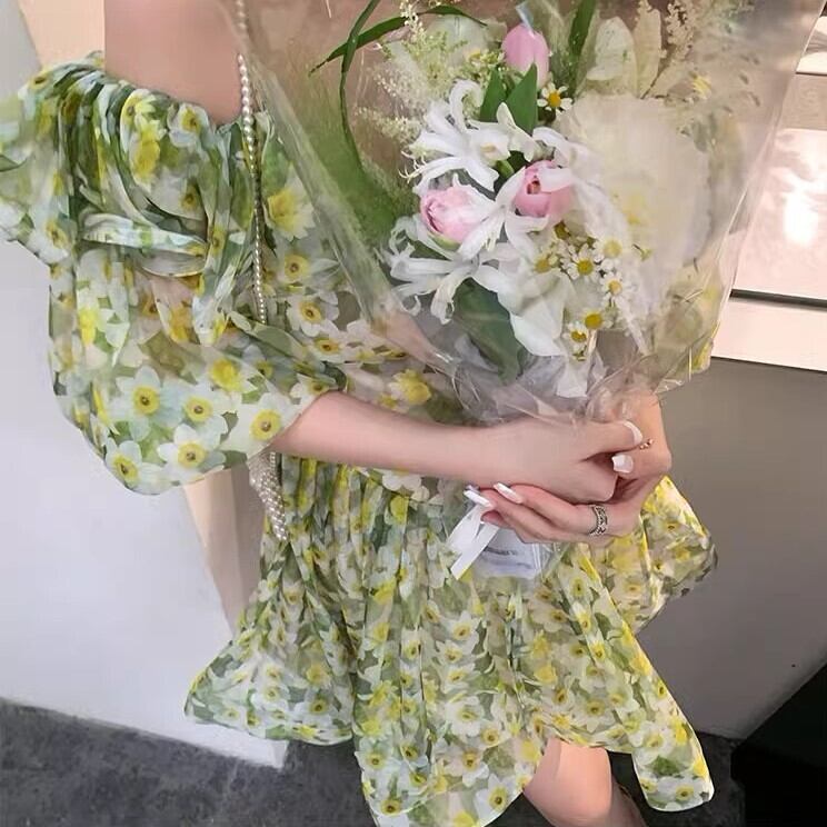 ふんわり袖 水仙柄 フローラルプリント レディース ワンピース サマードレス ミニ マイクロミニ 膝上 5分袖 7分袖 オフショルダー 肩紐付き フロント細リボン Aライン フェミニン ハイウエスト バックシャーリング かわいい 大人可愛い きれいめ シンプル カジュアル 上品 おしゃれ ガーリー ラブリー キュート ロマンティック 妖精風 花柄 総柄 夏 デート お出かけ リゾート 休日 バカンス ショッピング 韓国 オルチャン コーデ 脚長 普段使い モテ 清楚 スタイルアップ S M L グリーン