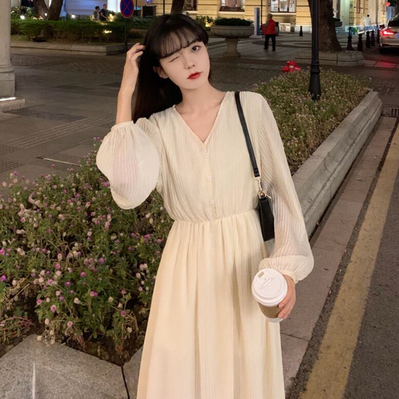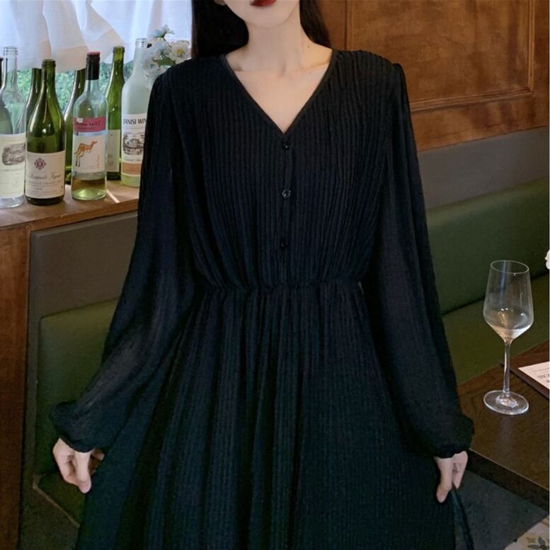 プリーツシフォンロングワンピース レディース ワンピース ロングワンピース シフォンワンピース プリーツワンピース Vネック 長袖 ボリュームスリーブ フロントボタン ハイウエスト フレア ベージュ レッド ブラック オシャレ シアー シンプル 可愛い キレイめ 上品 フェミニン カジュアル 春 夏 デイリー おでかけ オンオフ兼用 普段着 スマート 細見え スタイルアップ 高見え 新鮮 上級者 主役級 鮮度アップ 軽やか ゆったり 体型カバー インスタ