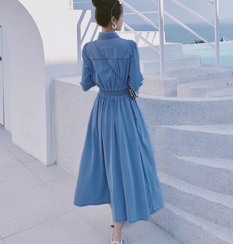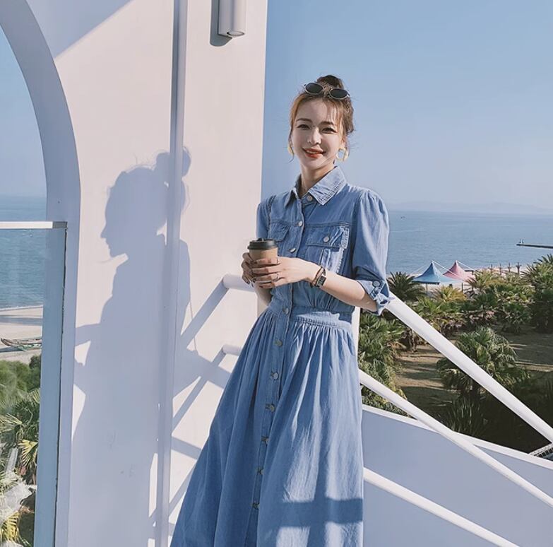 レディース スカート ワンピース オールインワン つなぎ シャツワンピ デニム ロングスカート ミモレ ロング 7分袖 襟付き ポロカラー セミフレア Aライン ウエストマーク 前開き アメカジ デニム ブルーデニム かわいい 大人可愛い きれいめ シンプル カジュアル 上品 おしゃれ かっこいい 個性的 主役級 存在感 抜け感 都会的 クラシカル カレッジ風 学生風 ベーシック ナチュラル 無地 春 夏 デート お出かけ リゾート 女子会 休日 バカンス ショッピング 普段使い S M L XL ブルー