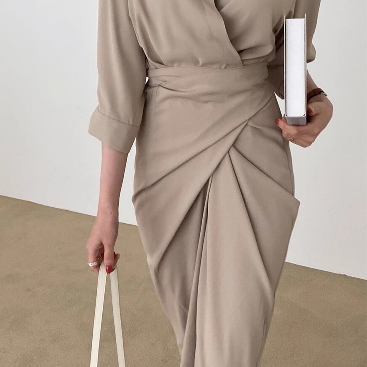 ウエストをクロスして結ぶデザインが特徴のラップデザインワンピース。カシュクール調のスキッパーデザインで首元に抜け感があり、クロスして後ろで結ぶリボン部分にはタック入りで雰囲気のあるフロントデザインを作り出します。