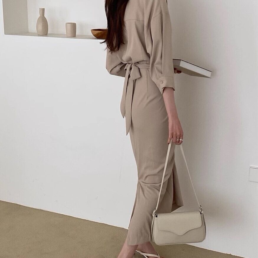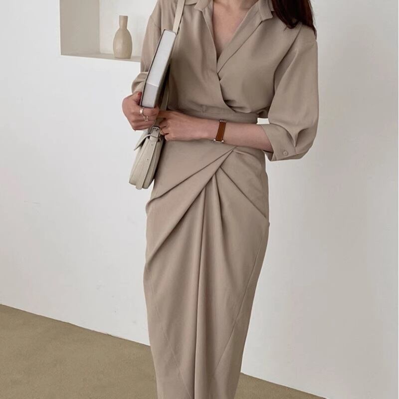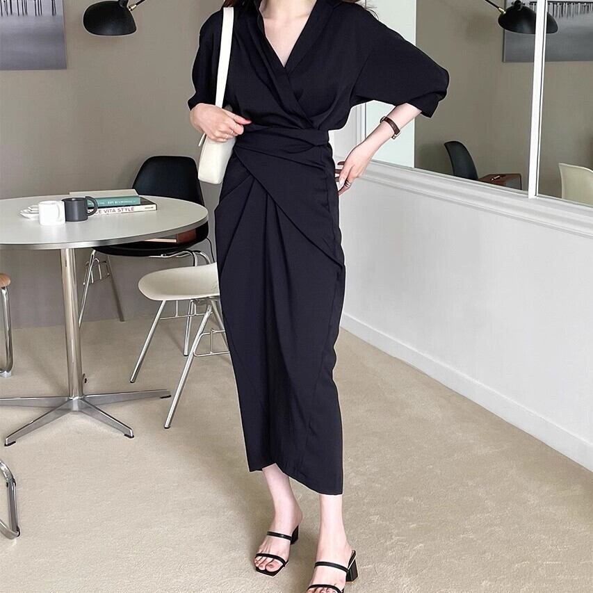 ウエストクロス ラップデザイン レディース ワンピース シャツワンピ 膝下 ミモレ ロング 5分袖 ドロップショルダー カシュクール 襟付き スキッパー Iライン タック ウエストマーク バックリボン きれいめ シンプル カジュアル 上品 おしゃれ かっこいい こなれ感 個性的 クール 大人っぽい スタイリッシュ 無地 春 夏 ママ 女の子 OL 通勤 学生 学校 通学 デート お出かけ 女子会 休日 カフェ 重ね着 韓国 オルチャン コーデ 体型カバー 脚長 普段使い フリーサイズ 黒 ブラック カーキ
