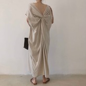 ナチュラルでリラックス感のあるオーバーサイズのVネックワンピース。フロントに施されたツイストデザインがポイントで、前後どちらでも着用できる2ウェイ仕様も魅力です。