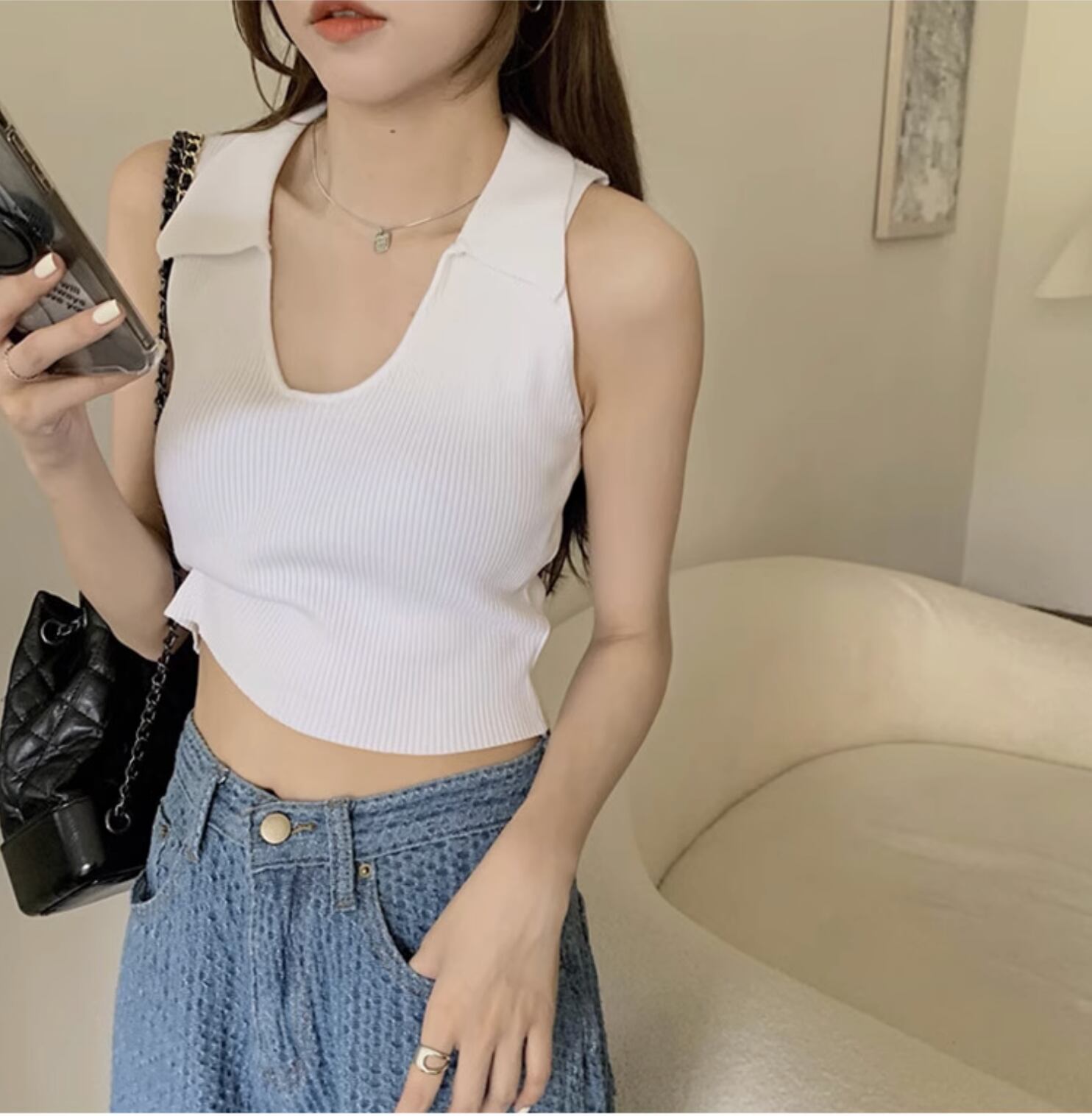 肌見せがセクシーなショート丈の襟付きタンクトップです。袖なしデザインで肩や二の腕をきれいに見せてくれます。インナーとしても使えます。