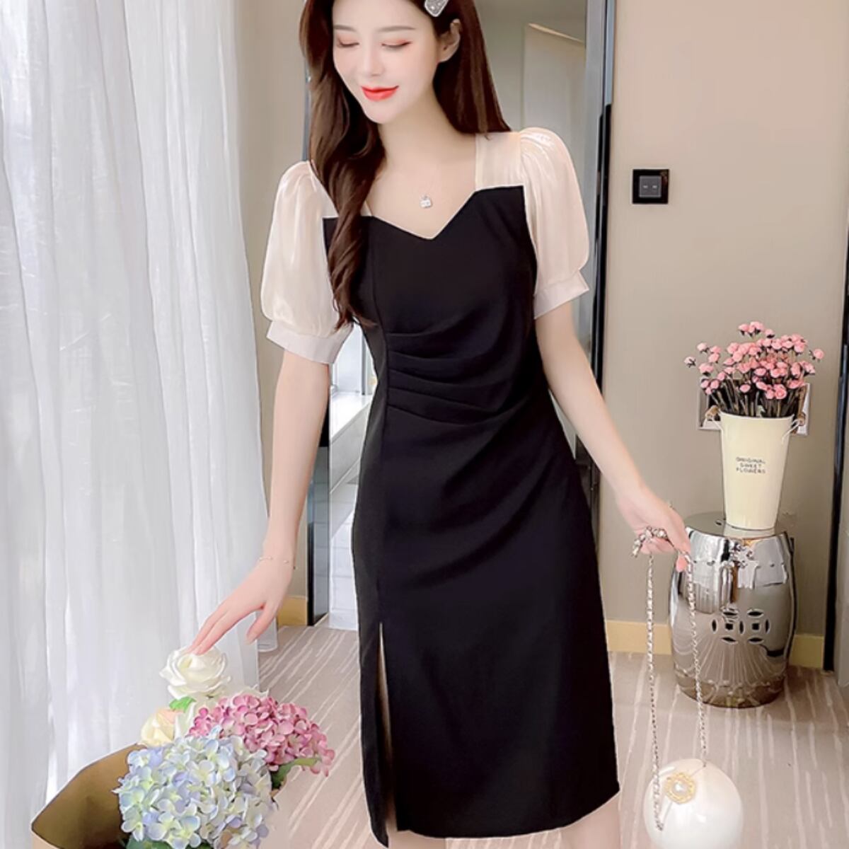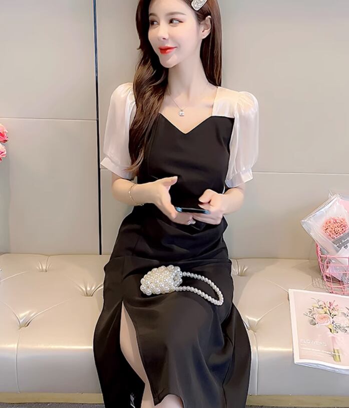 レディース スカート ワンピース タイトスカート 膝下 ミモレ 半袖 ボリューム袖 パフスリーブ Vネック 襟なし Aライン 切り替え フォーマル フェミニン スリット サイドスリット かわいい 大人可愛い きれいめ シンプル 上品 おしゃれ ガーリー 個性的 クール モード系 エレガント モダン 主役級 存在感 フォーマル ラブリー キュート プリンセス クラシカル ロマンティック 無地 春 夏 デート お出かけ パーティー イベント 合コン コーデ モテ 清楚 S M L XL ホワイト ブラック