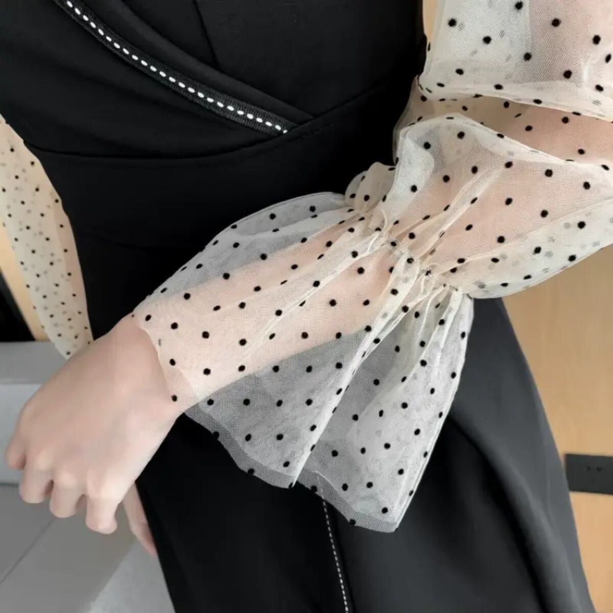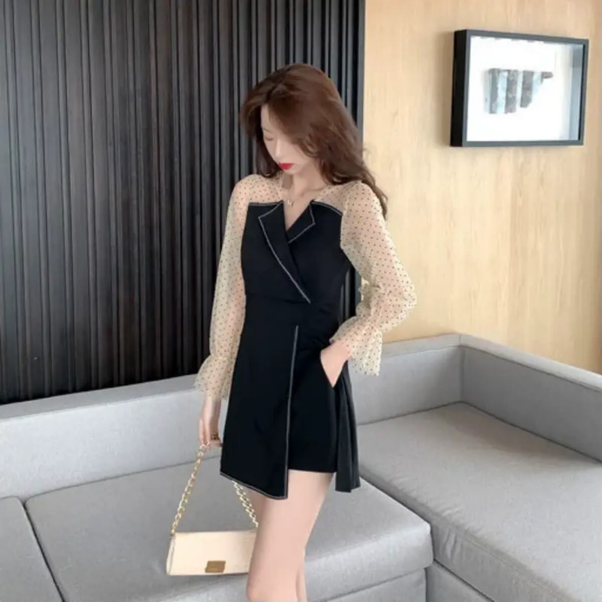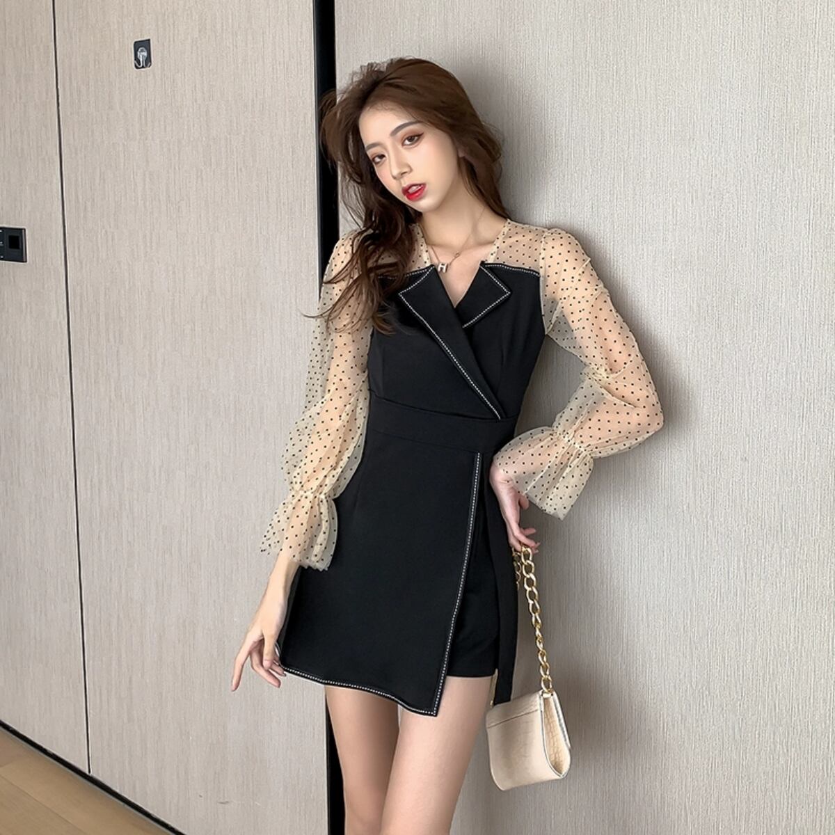 レディース ワンピース ミニ 長袖 パフスリーブ ポエットスリーブ Vネック 襟付き Aライン 切り替え フェミニン シフォン ポケット ハイウエスト 透け感 シースルー 異素材ミックス かわいい 大人可愛い 上品 おしゃれ ガーリー 個性的 エレガント 抜け感 ラブリー キュート ロマンティック 大人女子 セクシー お洒落 華やか ドット柄 水玉 春 夏 秋 ロングシーズン 女性用 デート お出かけ 女子会 ショッピング 韓国 オルチャン 脚長 スタイルアップ S M L XL 2XL 黒 ブラック