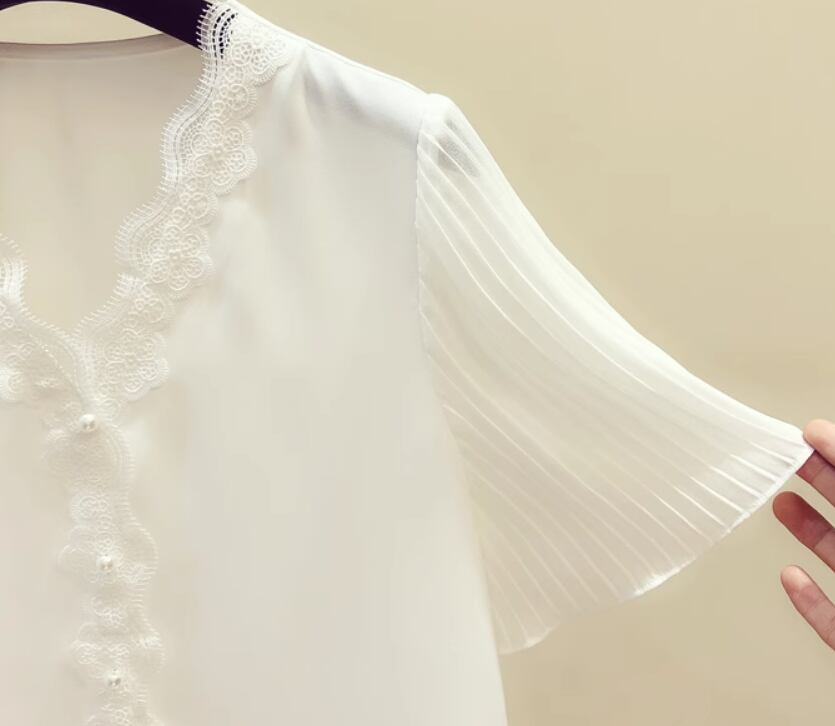 透け感あるシフォン素材と上品なレースが魅力の半袖シャツ