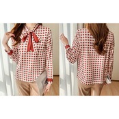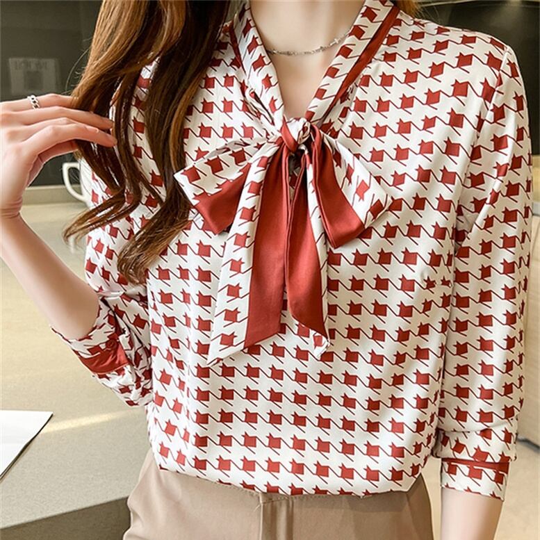 千鳥柄ボウタイとろみシャツ レディース トップス シャツ ブラウス ボウタイブラウス とろみブラウス 長袖 リボン チェック柄 総柄 ボウタイシャツ シフォンシャツ とろみ 光沢 赤 レッド オシャレ きちんと感 可愛い キレイめ 上品 フェミニン トラッド シック 知的 ハンサム カジュアル 春 夏 秋 冬 デイリー おでかけ 仕事 オンオフ兼用 普段着 スマート 細見え スタイルアップ 高見え 新鮮 上級者 主役級 鮮度アップ ゆったり 体型