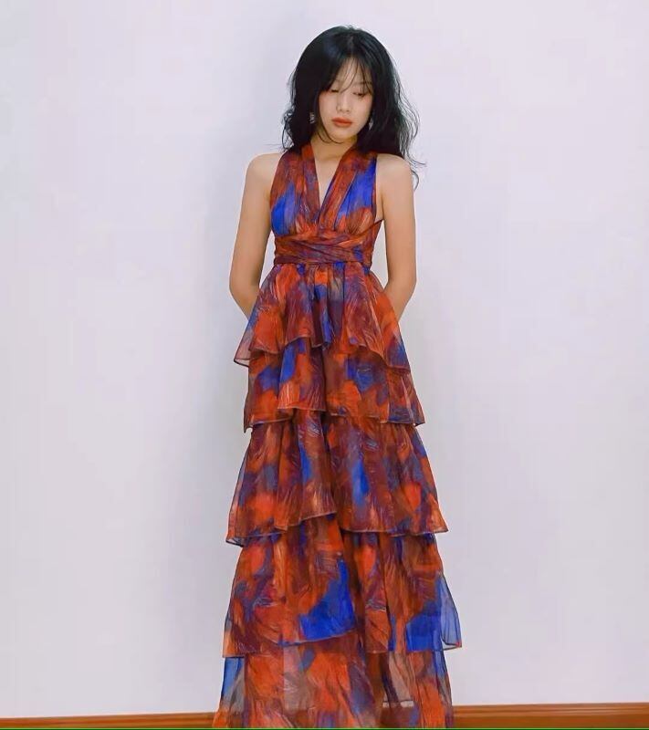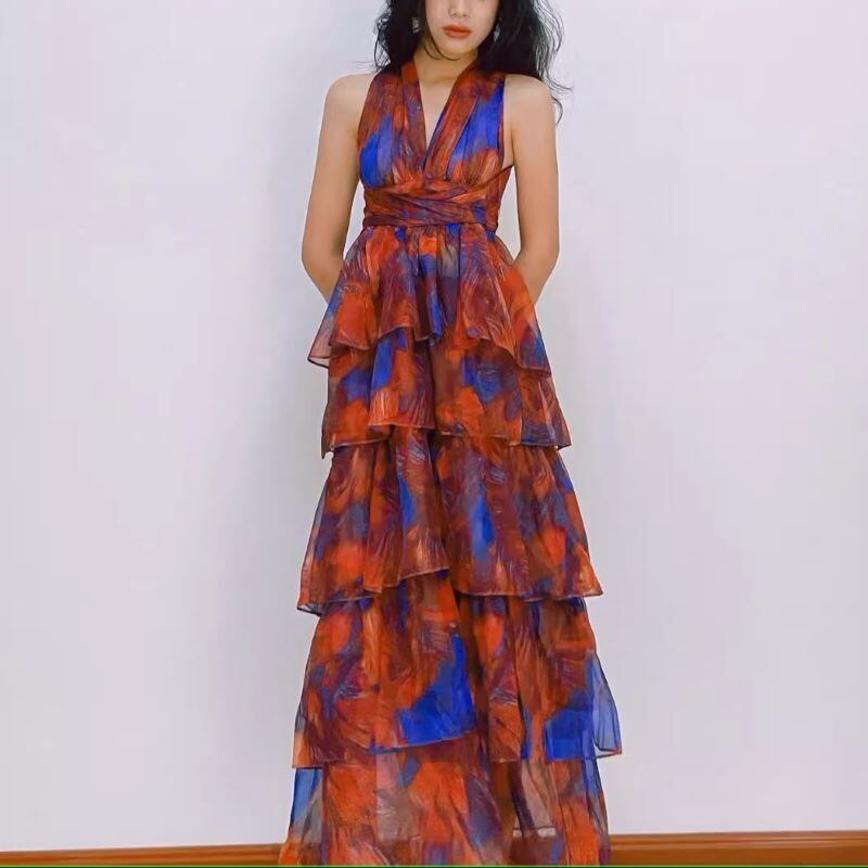 バッククロス ペイント柄 モンロー風ネック ティアードワンピ サマードレス レディース ワンピース 膝下 ロング マキシ 袖なし ノースリーブ ホルターネック Aライン Vネック 背中開き フェミニン ウエストマーク バックリボン バックコンシャス ハイウエスト きれいめ シンプル カジュアル エキゾチック 存在感 ボヘミアン セクシー 女っぽ プリント 総柄 夏 女の子 デート リゾート 旅行 ビーチ 休日 バカンス 韓国 オルチャン コーデ 体型カバー 脚長 インスタ映え S M L 赤系 大人カラー