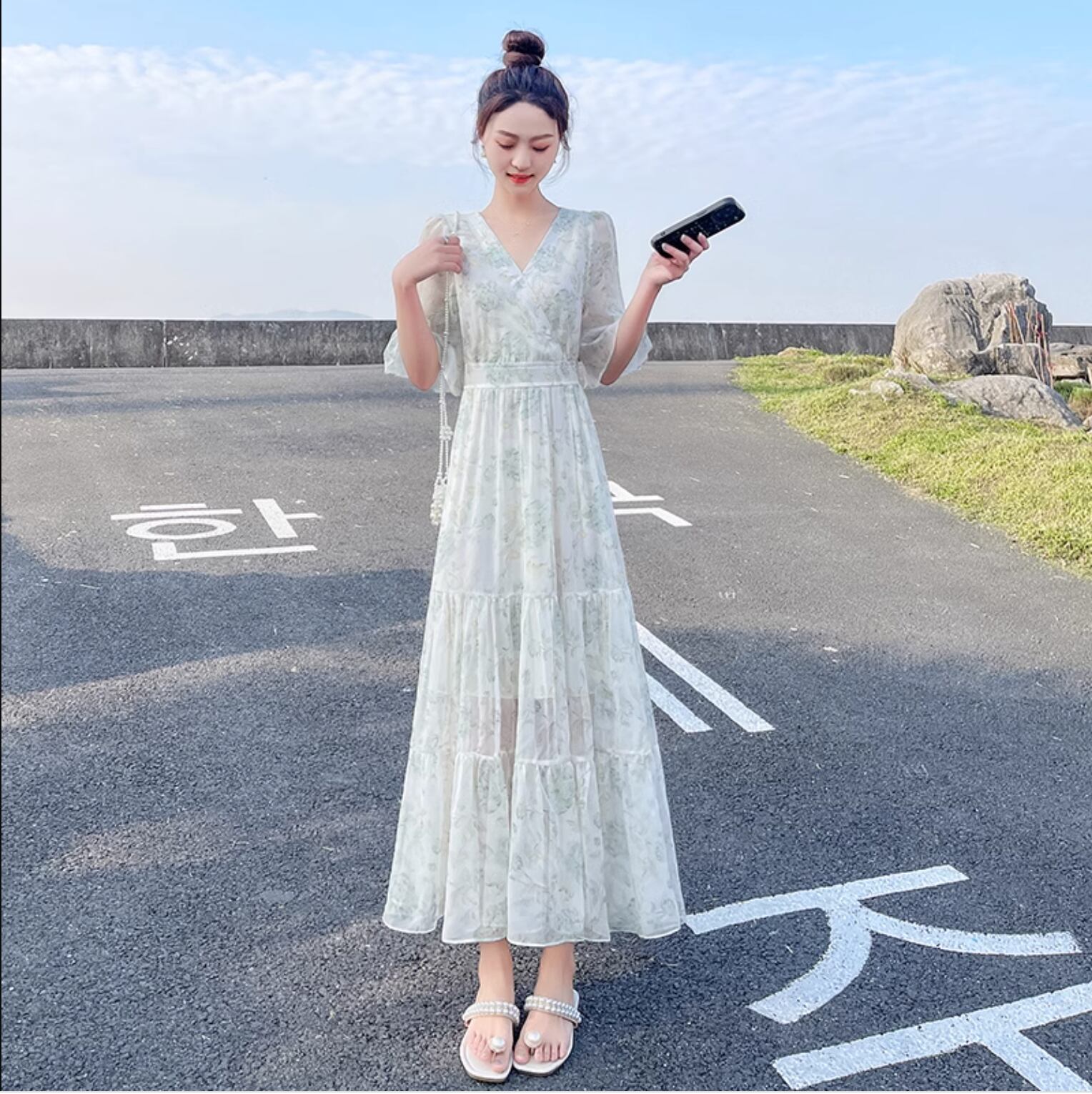 ティアードワンピース レディース フレア ロング マキシ 5分袖 Vネック カシュクール フロントクロス シフォン ハイウエスト 透け感 シースルー かわいい 大人可愛い きれいめ シンプル カジュアル 上品 おしゃれ レトロ こなれ感 ガーリー エレガント 抜け感 ラブリー キュート ナチュラル 花柄 春 夏 ママ オフィス ビジネス OL 通勤 デート お出かけ お泊まり パーティー イベント 女子会 バカンス 重ね着 体型カバー 普段使い 着回し モテ 清楚 S M L XL 2XL 黒 グリーン