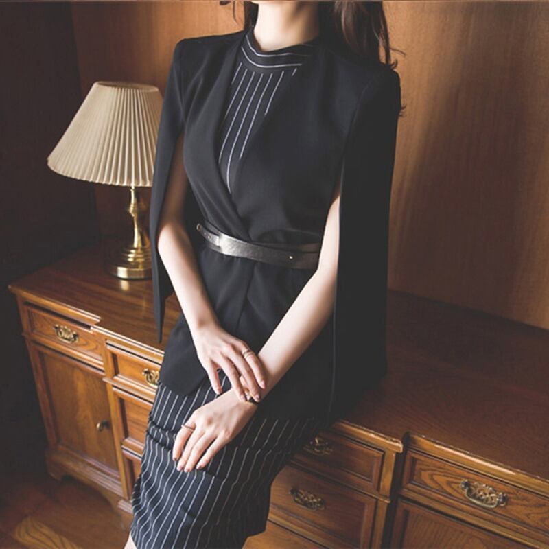 個性的なデザインのジャケットとピンストライプ柄ワンピースのスタイリッシュなセットアップ。ワンピースは深めのバックスリットが女性らしく、スタイルよく見せてくれるハイウエストデザインのタイトシルエットです。ジャケットは腕部分にスリットが入ったポンチョ風デザインが個性的でおしゃれに決まります。
