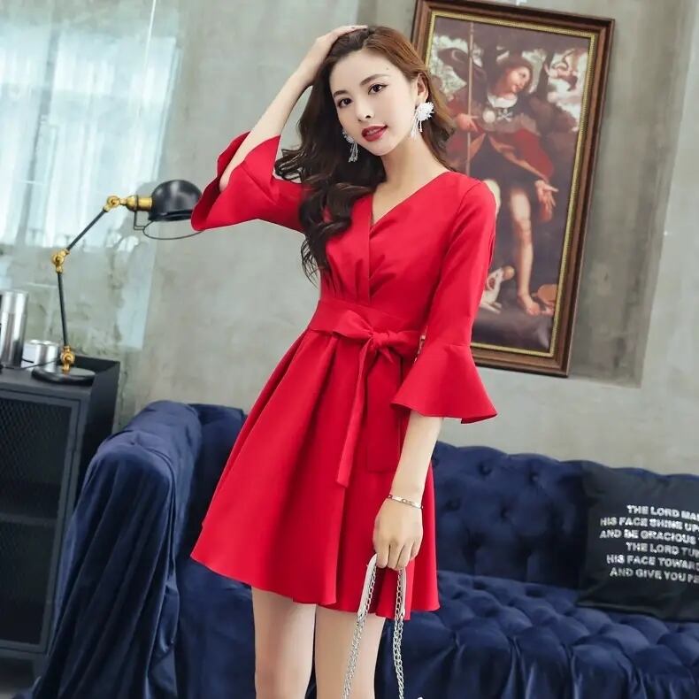 レディース フレアワンピース ワンピース ミニ ショート 7分袖 ベルスリーブ 七分袖 Vネック フレア Aライン フェミニン ウエストマーク ウエストリボン ハイウエスト かわいい きれいめ シンプル カジュアル 上品 おしゃれ ガーリー 個性的 エレガント 主役級 存在感 抜け感 ラブリー キュート プリンセス ロマンティック お洒落 華やか 無地 春 秋 女性用 女の子 10代 20代 デート お出かけ パーティー 体型カバー 美脚 脚長 スタイルアップ S M L XL レッド