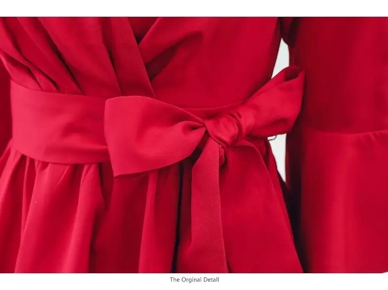 鮮やかなレッドのミニ丈フレアワンピースです。このワンピースは、華やかさと可愛らしさを兼ね備えた主役級の存在感を持っています。抜け感のあるスタイリングが叶い、ロマンティックな雰囲気を醸し出すことができます。ウエストリボンとベルスリーブが華やかさを演出し、Vネックで女性らしい印象を与えます。Aラインのフレアシルエットが、スタイルを美しく見せてくれます。