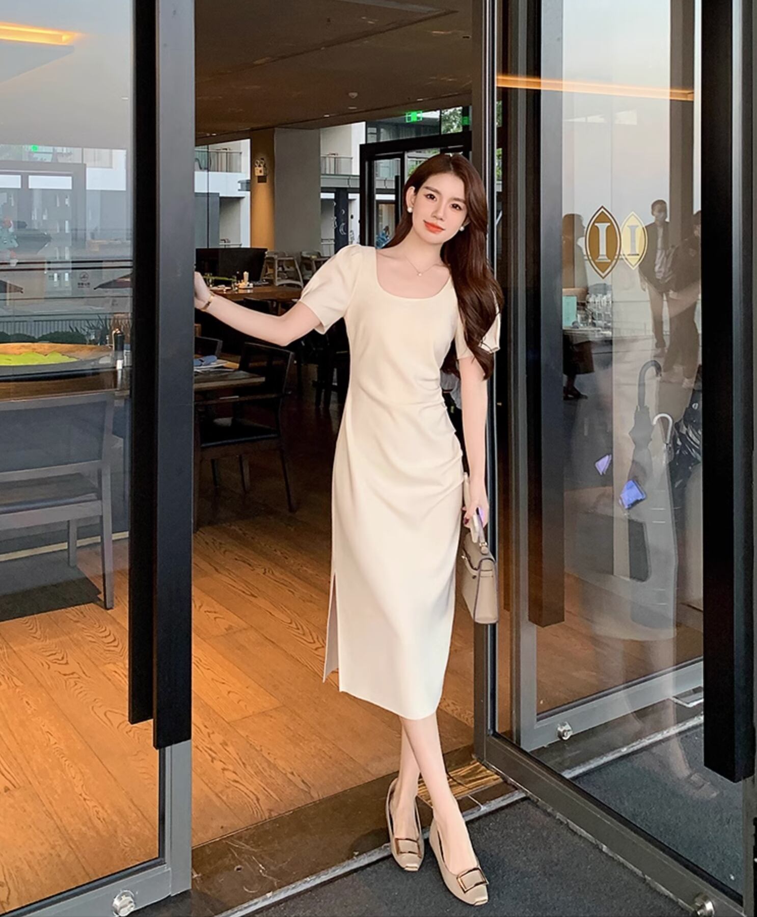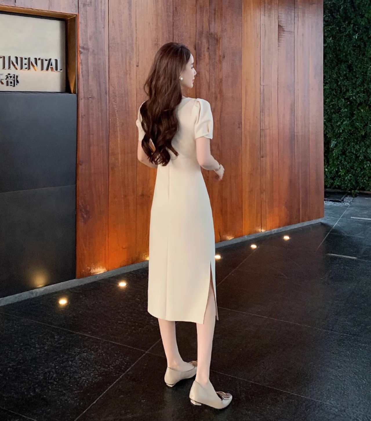 ワンピース レディース ドレス ロング 半袖 パフスリーブ スクエアネック タイト フェミニン ハイウエスト ギャザー かわいい 大人可愛い きれいめ シンプル カジュアル 上品 おしゃれ レトロ こなれ感 クール エレガント フォーマル 無地 夏 入学式 入園式 謝恩会 シーズンレス セレモニー ママ オフィス ビジネス OL 通勤 デート お出かけ パーティー イベント レストラン 女子会 休日 韓国 オルチャン コーデ 体型カバー 普段使い 着回し モテ 清楚 トレンド 定番 S M L 白