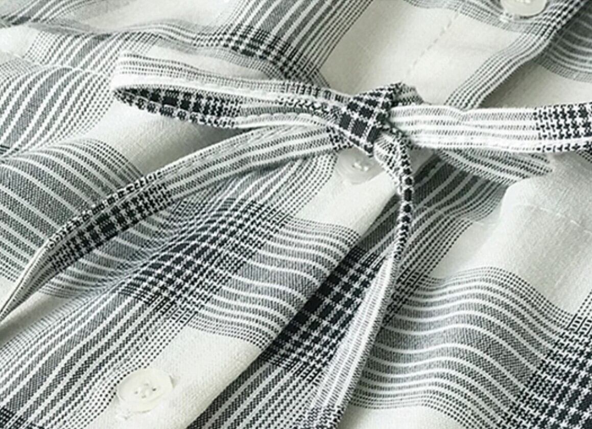 ウエストリボンでメリハリをつけて、体型カバーにも。薄手の生地は、春夏の着こなしにぴったり。チェック柄がナチュラルな印象を与えます。