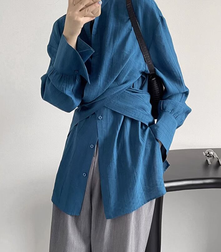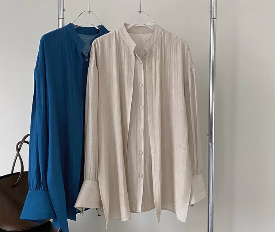 レディース トップス ブラウス カットソー 前開き 長袖 ボリューム袖 パフスリーブ 萌袖 スタンドカラー 異国風 ギャザー 薄手 大人可愛い きれいめ シンプル カジュアル 上品 おしゃれ かっこいい レトロ アジアン エスニック エキゾチック こなれ感 ラフ メンズライク ルーズ 個性的 クール モード系 エレガント モダン 主役級 存在感 とろみ感 抜け感 都会的 ラグジュアリー クラシカル ロマンティック ナチュラル 無地 春 秋 OL 通勤 お出かけ 旅行 バカンス M L ブルー アプリコット