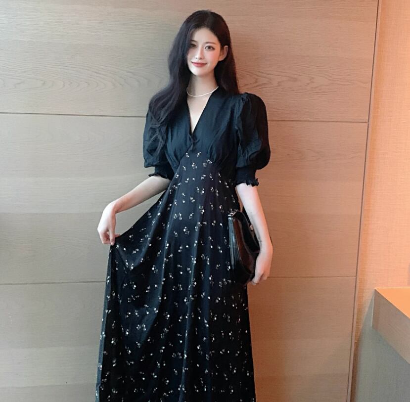 レディース スカート ワンピース オールインワン ドレス フレアスカート ロングスカート ロング マキシ 丈長 半袖 パフスリーブ フリル袖 Vネック 襟なし フレア フォーマル フェミニン 異国風 切り替えデザイン かわいい 大人可愛い きれいめ シンプル 上品 おしゃれ こなれ感 ラフ ガーリー 個性的 エレガント 主役級 存在感 ラブリー ロマンティック 花柄 フラワー 夏 デート パーティー レストラン 女子会 合コン コンパ 婚活 モテ 清楚 M L XL 2XL 3XL 4XL ブラック
