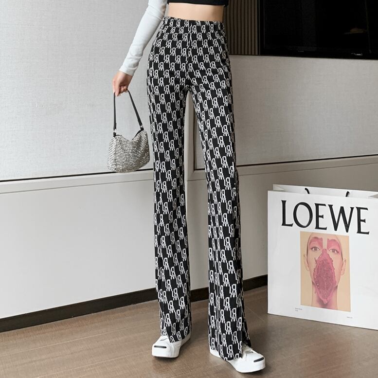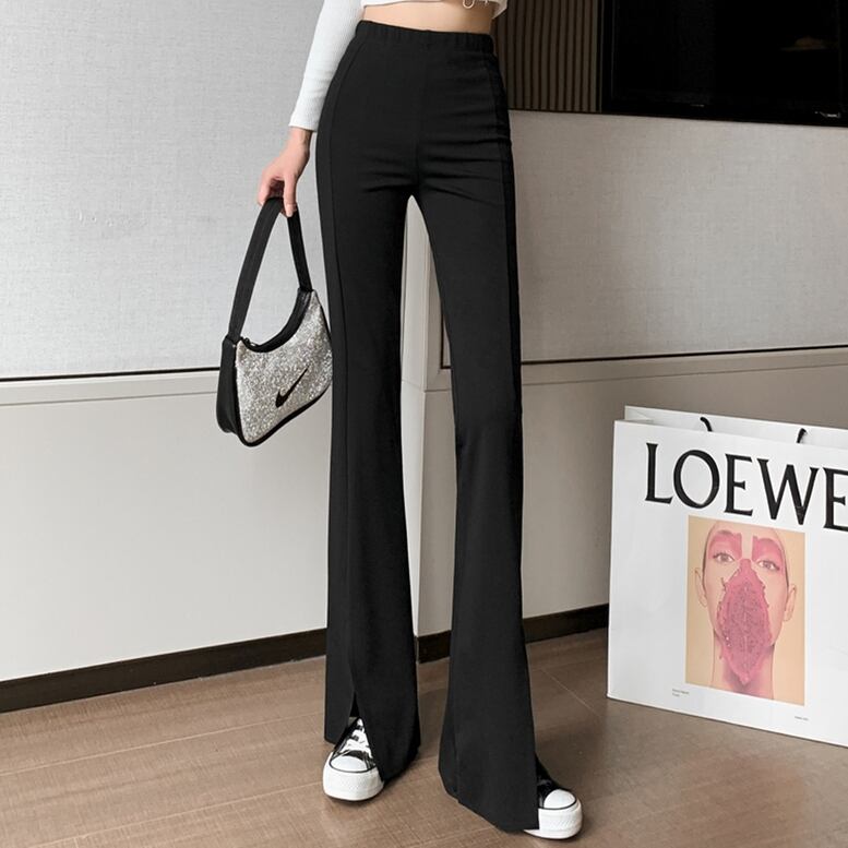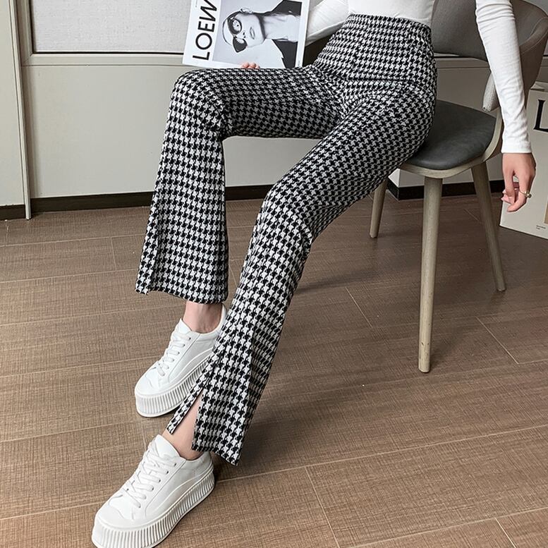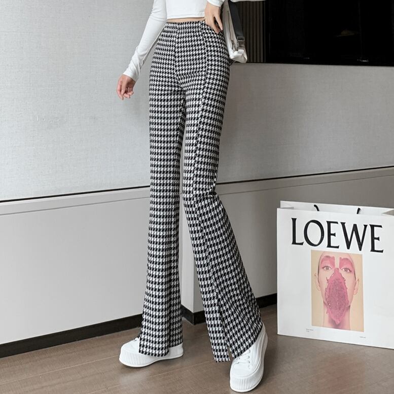 センタースリットパンツ レディース ボトムス パンツ スリットパンツ フレアパンツ ハイウエスト スリット入り ロングパンツ 黒 ブラック 千鳥柄 ロゴ 無地 オシャレ シンプル 可愛い キレイめ 上品 フェミニン シック 知的 ハンサム マニッシュ カジュアル デイリー おでかけ 仕事 オンオフ兼用 普段着 スマート 細見え スタイルアップ 高見え 新鮮 上級者 主役級 鮮度アップ 美脚見え 脚長 動きやすい 軽やか ゆったり 体型カバー