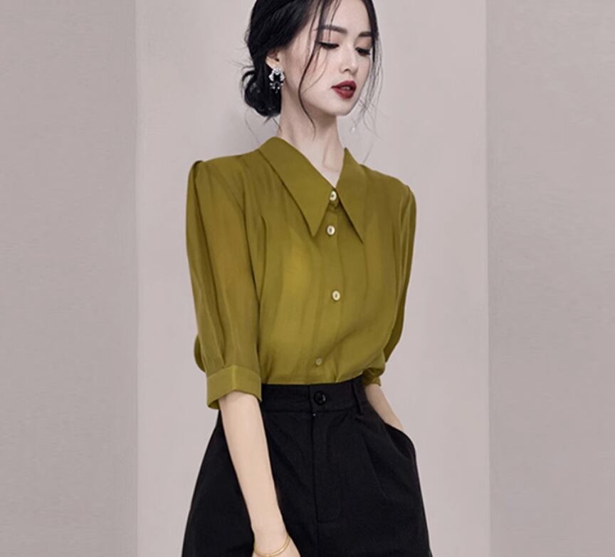 レディース トップス シャツ ブラウス 前開き Yシャツ 5分袖 パフスリーブ 襟付き 角襟 透け感 シースルー ボタン 薄手 かわいい 大人可愛い きれいめ シンプル 上品 おしゃれ かっこいい レトロ こなれ感 クール 主役級 存在感 とろみ感 抜け感 キュート 都会的 ベーシック ナチュラル 無地 夏 オフィス ビジネス OL 通勤 デート お出かけ レストラン 女子会 休日 ホテル 発表会 合コン コンパ カフェ 婚活 コーデ 普段使い モテ 清楚 S M L XL ホワイト イエロー 大人カラー