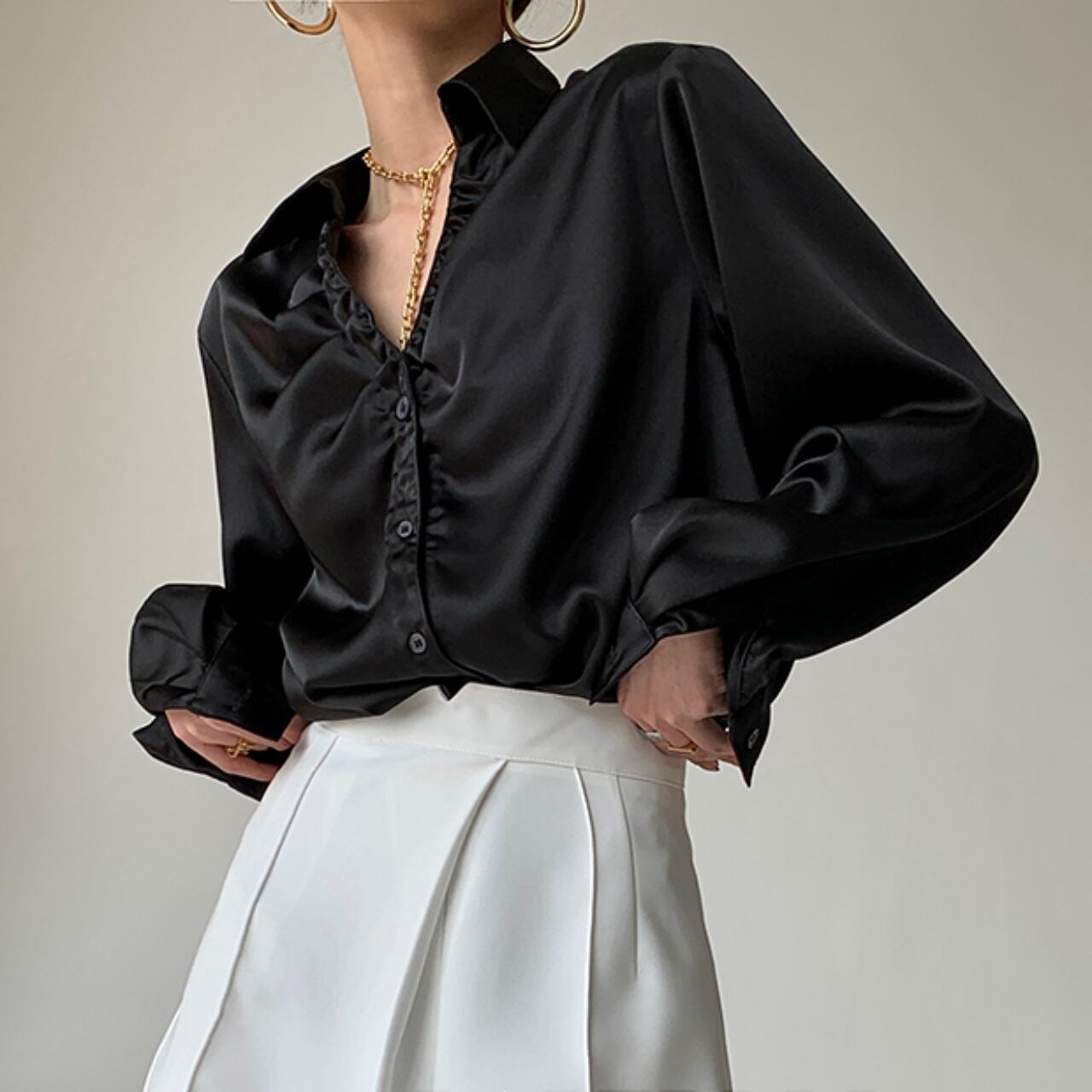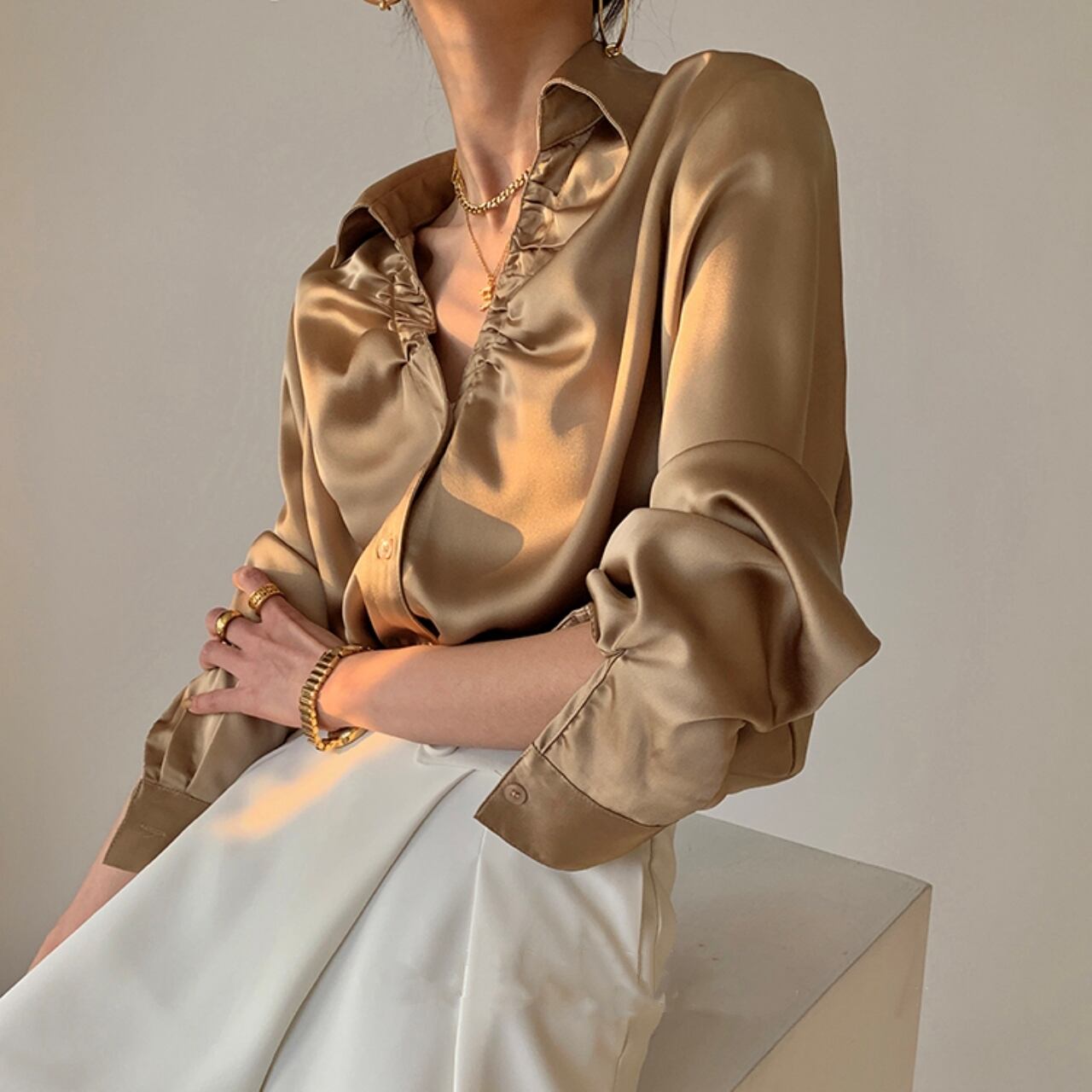 レディース シャツ ブラウス 長袖 Vネック 襟付き 角襟 前開き 異国風 コンサバ ボタン 光沢感 サテン かわいい 大人可愛い きれいめ シンプル カジュアル 上品 おしゃれ かっこいい エキゾチック こなれ感 メンズライク マニッシュ ボーイッシュ ルーズ 個性的 クール エレガント とろみ感 抜け感 キュート 都会的 ラグジュアリー 大人っぽい 大人女子 セクシー 色気 お洒落 華やか 無地 春 秋 冬 ロングシーズン 女性用 楽ちん 普段使い 着回し モテ デイリー ゆったり ゆる