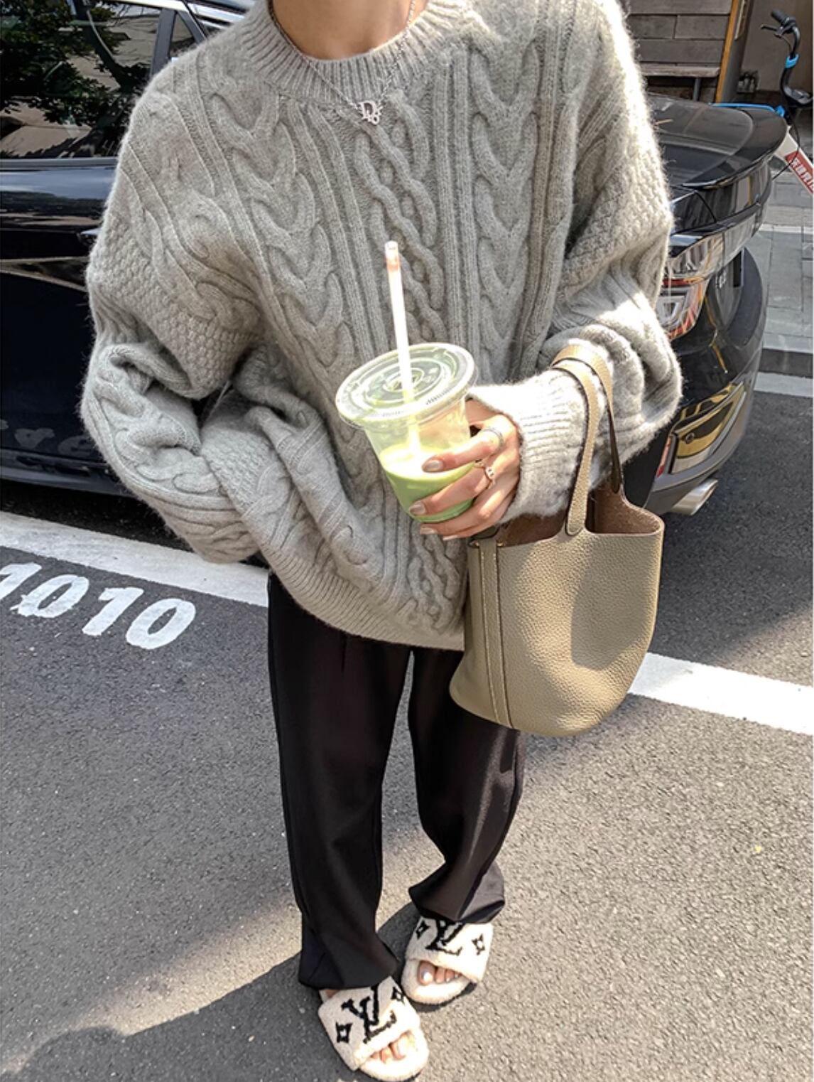 オーバーサイズ のゆったりとしたシルエットのケーブル編みニットです。コーディネート次第で、大人可愛い、きれいめ、カジュアルなど、さまざまなスタイリングに対応できます。使いやすいカラーで着回し力も抜群です。