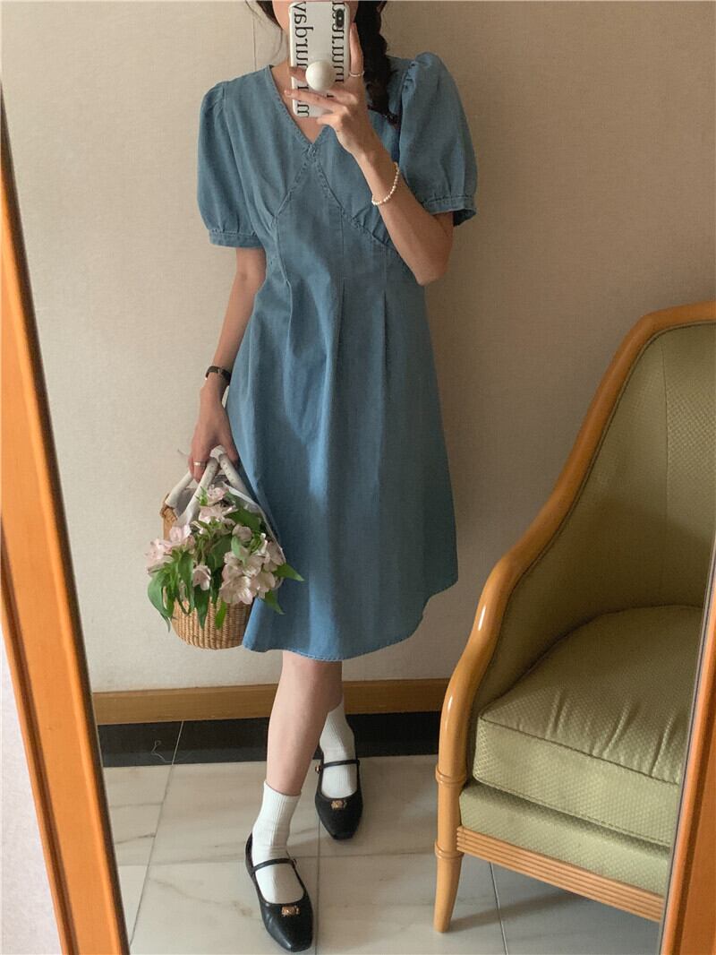 レディース ワンピース シャツワンピ デニム 膝下 ミモレ 半袖 5分袖 ボリューム袖 パフスリーブ Vネック ワイド フレア セミフレア Aライン ウエストマーク 切り替えデザイン デニム ブルーデニム かわいい 大人可愛い きれいめ シンプル カジュアル おしゃれ こなれ感 ラフ 主役級 ラブリー キュート 学生風 ナチュラル 無地 春 夏 秋 学生 学校 通学 デート お出かけ お泊まり 旅行 女子会 休日 ショッピング お揃い 双子 楽ちん S M ゆったり ブルー ネイビー