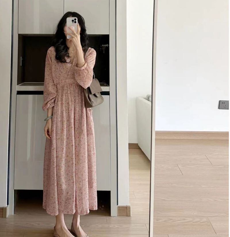 フロントタック フローラルプリント 裾シアー レディース ワンピース 膝下 ミモレ ミディアム丈 長袖 パフスリーブ ボリューム袖 Vネック 襟なし カシュクール風 フレア ハイウエスト 透け感 軽やか かわいい 大人可愛い きれいめ シンプル カジュアル 上品 おしゃれ ガーリー ナチュラル フェミニン 花柄 フラワー 総柄 春 秋 ママ 女の子 OL 通勤 学生 学校 通学 デート お出かけ 休日 カフェ 韓国 オルチャン コーデ 脚長 普段使い XS S M L XL 小さいサイズ くすみカラー