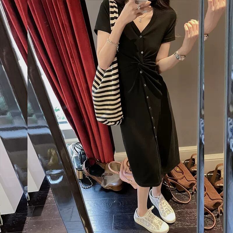レディース スカート ワンピース オールインワン ドレス 前開き タイトスカート 膝下 ミモレ 半袖 Vネック スリム 細身 伸縮性 大人可愛い シンプル カジュアル おしゃれ かっこいい こなれ感 ラフ メンズライク ナチュラル 無地 春 夏 秋 アウトドア パーティー イベント リゾート 女子会 休日 ライブ フェス コーデ 楽ちん 普段使い S M L XL 黒 ブラック グレー