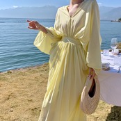 レディース スカート ワンピース オールインワン ドレス フレア ロング バットスリーブ Vネック Aライン 背中開き ウエストマーク ハイウエスト ウエストゴム 薄手 大人可愛い きれいめ シンプル 上品 おしゃれ アジアン 個性的 存在感 ラグジュアリー 無地 春 夏 マタニティ パーティー イベント リゾート 体型カバー S M L XL 黄色 イエロー オフホワイト