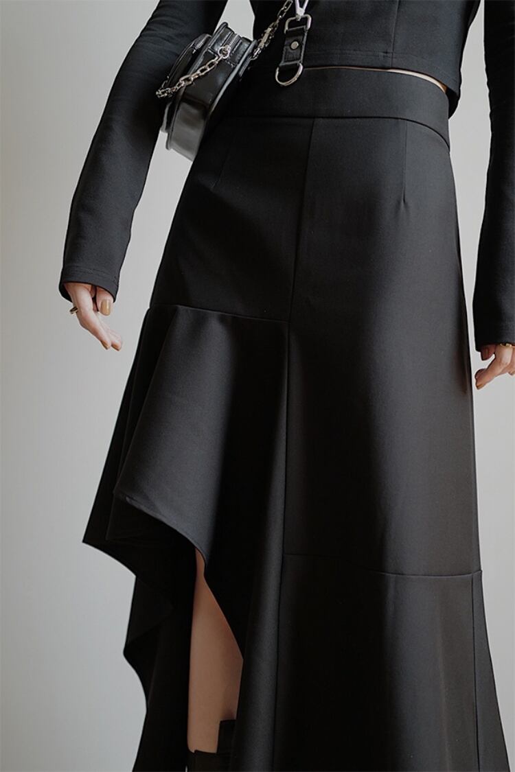 アシンメトリーデザインとワイドな裾が、モードな雰囲気でありながらエレガントなフレアスカートです。Aラインのシルエットが女性らしさを引き立て、華やかさを演出します。ハイウエストで脚長効果も期待でき、体型をカバーしながら美脚を演出することができます。