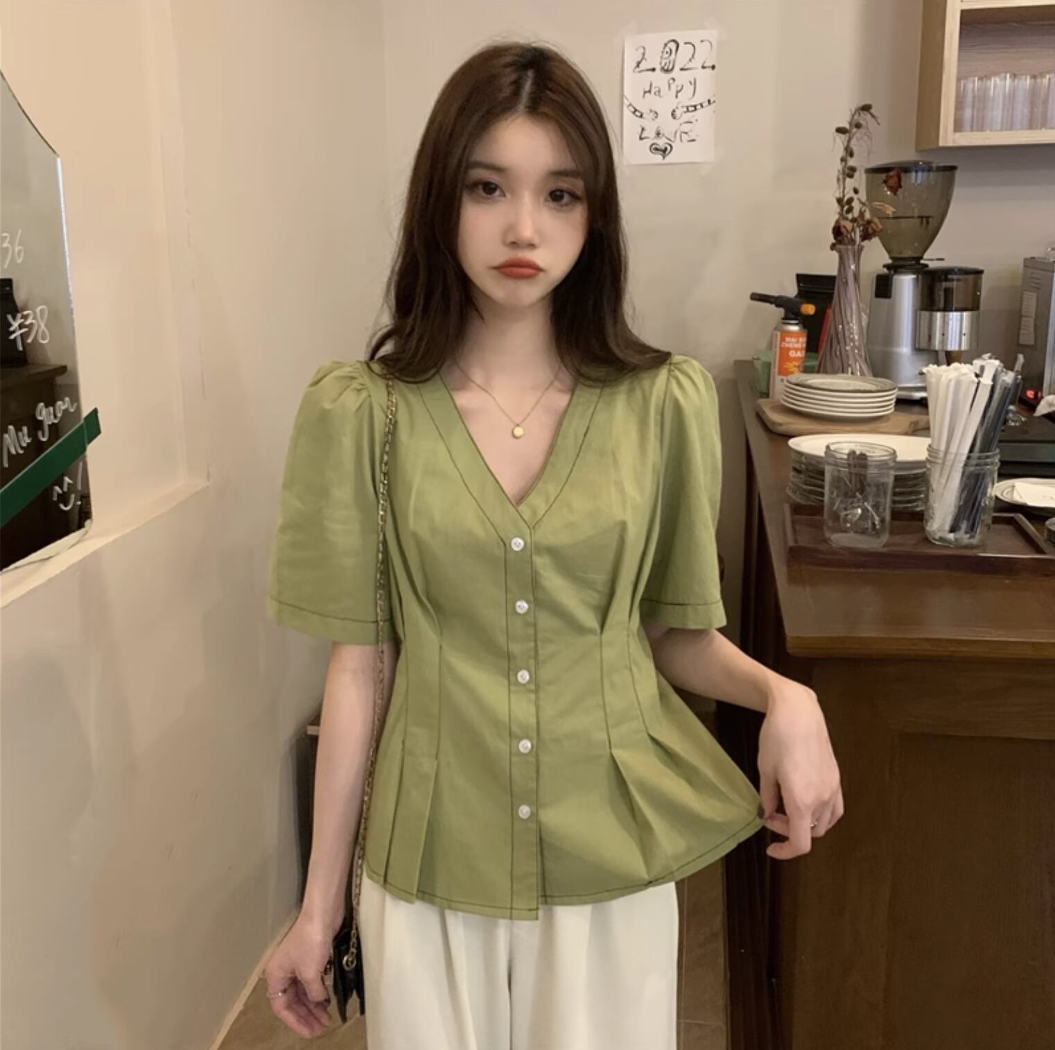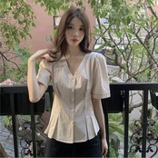 ウエストタックペプラムブラウス レディース トップス シャツ ショート 半袖 Vネック 前開き ボタン かわいい 大人可愛い きれいめ シンプル カジュアル 上品 おしゃれ レトロ こなれ感 ガーリー カントリー 無地 春 夏 オフィス ビジネス OL 通勤 学生 デート お出かけ お泊まり イベント リゾート 旅行 海 プール レストラン ビーチ 女子会 休日 バカンス 重ね着 韓国 オルチャン コーデ 普段使い 着回し レイヤード 清楚 定番 二の腕カバー S M L XL アプリコット グリーン