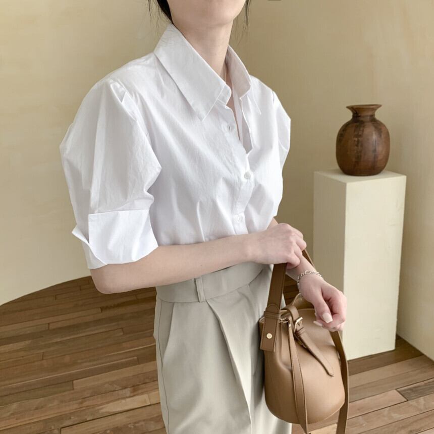 袖を捲ったような半袖デザインがポイントのワイシャツです。コンサバティブな雰囲気がありつつも、カジュアルなスタイリングにもピッタリです。シンプルなデザインでありながら、さりげなくエレガントな印象を演出します。大人女子にぴったりの清潔感とお洒落さを兼ね備えた一枚です。
