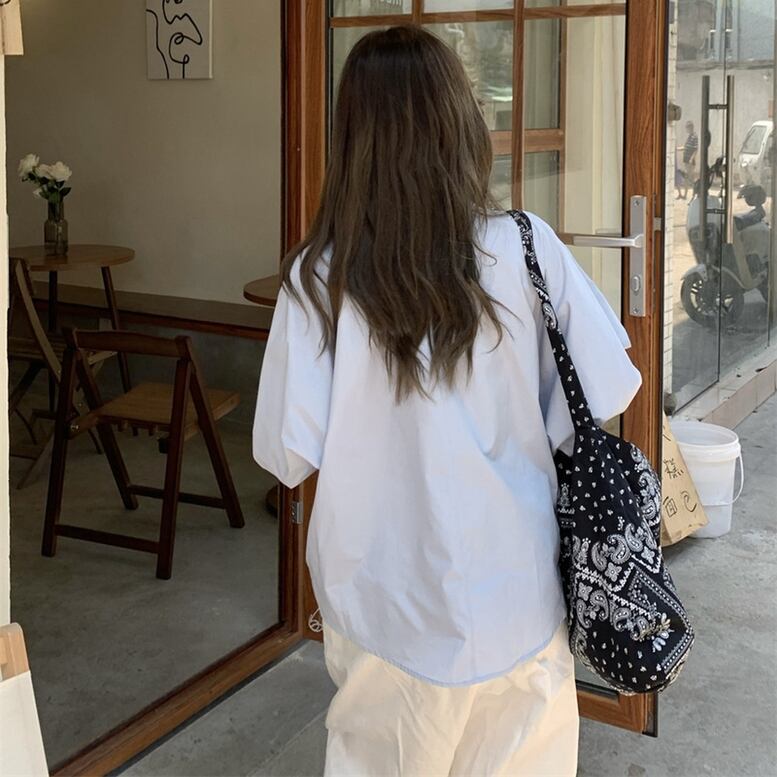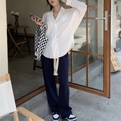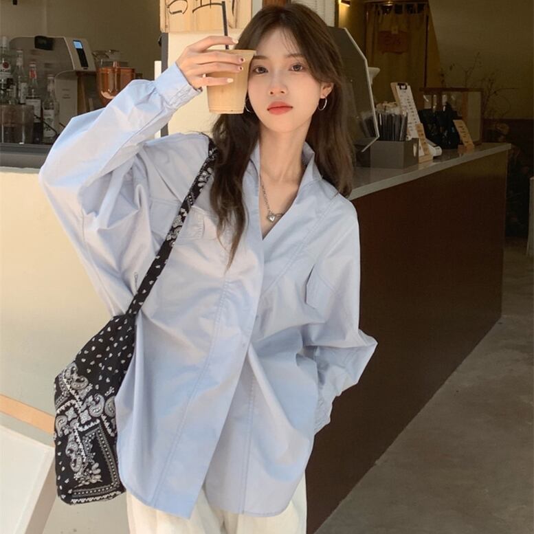 Vネックノーカラーオーバーシャツ レディース トップス シャツ Vネック 長袖 ノーカラーシャツ ブラウス オーバーサイズ ホワイト ライトブルー オシャレ シンプル 可愛い キレイめ 上品 フェミニン カジュアル デイリー おでかけ オンオフ兼用 スマート 細見え スタイルアップ 高見え 新鮮 上級者 主役級 鮮度アップ オーバーサイズ ゆったり 体型カバー インスタ映え トレンド シャーベットカラー アースカラー