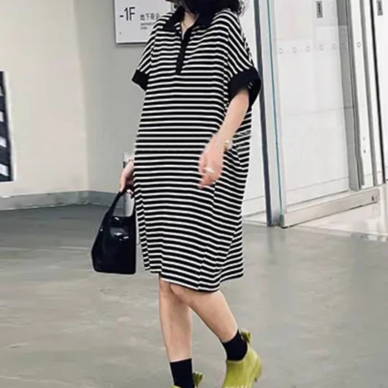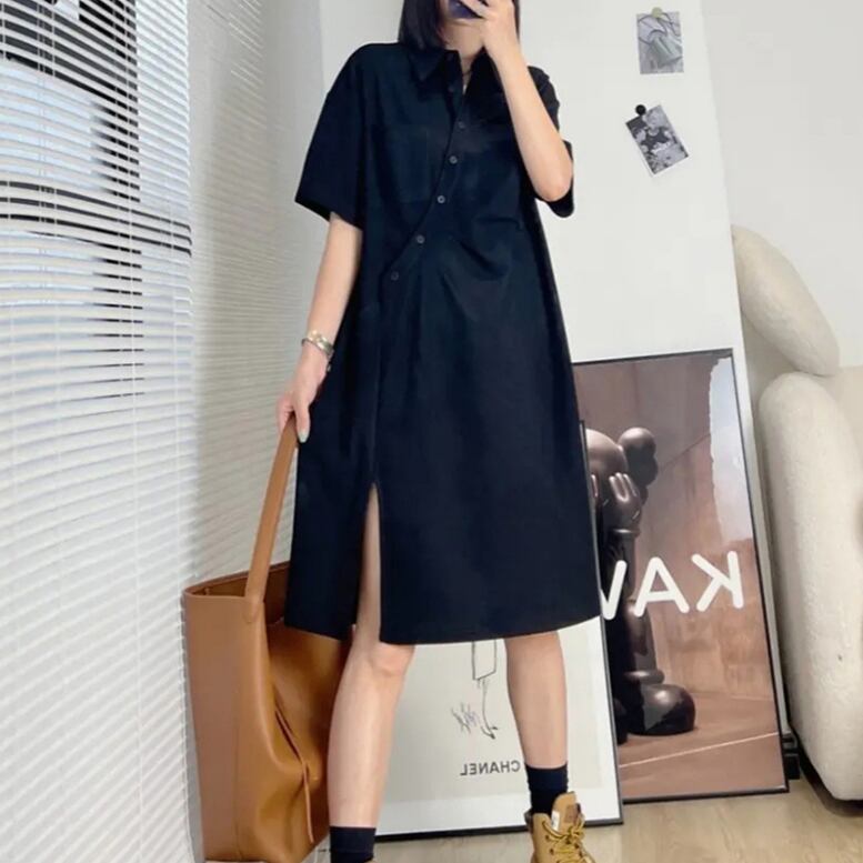 斜めに配置されたボタンデザインがポイントで、シャープな印象を与えると同時に、女性らしい優雅さも演出します。また、半袖のひざ丈でありながら、スリットが入っているので軽やかさと動きやすさを両立しています。シンプルながらも上品で可愛らしいスタイリングを叶えます。オーバーサイズのゆったりとしたシルエットは体型カバー効果もあり、自信を持って着こなせる一枚です。トレンド感溢れるコーディネートを楽しむこともできます。インスタ映えするフォトジェニックなルックスで、SNSでも注目の的になること間違いなしです。このアシメボタン襟付きシャツワンピースで、新鮮なスタイルを手に入れませんか?大人の女性の主役級アイテムとして、さまざまな場面で活躍すること間違いありません。是非、お手元にお届けいたします。
