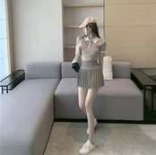 半袖トップスとミニスカートのキュートなセットアップです。ポロカラーが上品な雰囲気を醸し出し、ハイウエストのプリーツスカートは脚長効果も期待できます。夏のデートやお出かけ、スポーツなどさまざまなイベントにぴったりです。