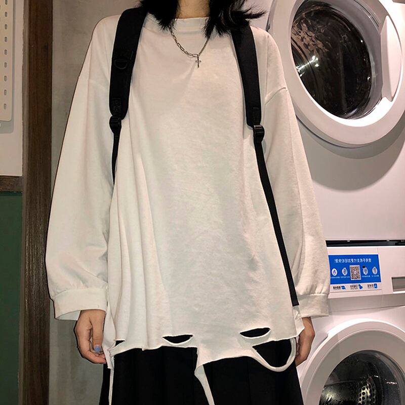 裾ダメージ加工 オーバーサイズ レディース トップス ロンT プルオーバー Tシャツ カットソー ミディアム丈 長袖 ドロップショルダー クルーネック 襟なし ストレート シンプル カジュアル おしゃれ かっこいい こなれ感 ラフ ボーイッシュ 個性的 ストリート ヒップホップ 無地 春 秋 冬 ユニセックス ママ 女の子 学生 学校 通学 お出かけ 休日 重ね着 楽ちん 体型カバー 普段使い 着回し レイヤード M L XL 2XL 大きいサイズ ゆったり ゆる 白 ホワイト 黒 ブラック モノトーン